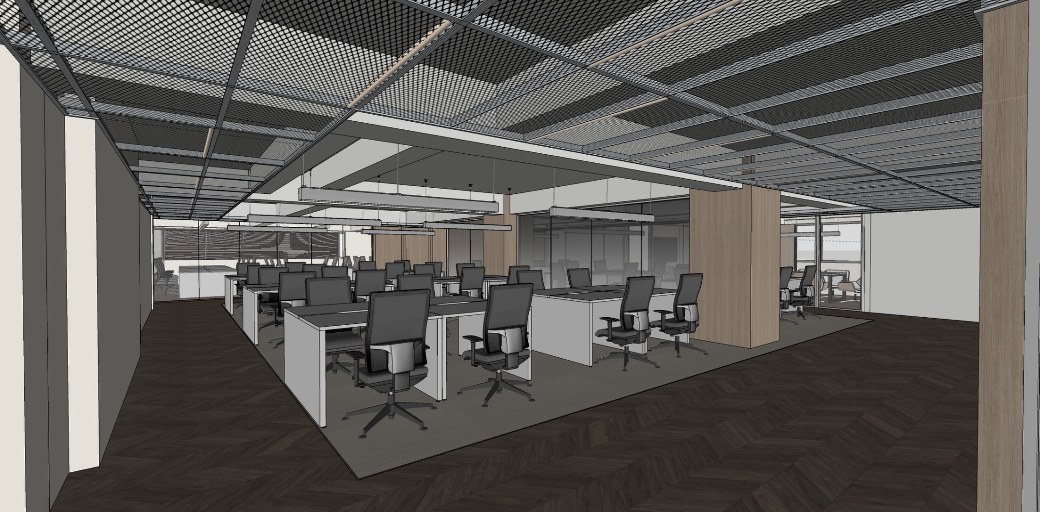 a beautifully rendered modern office space with sleek minimalist design the atmosphere is professional yet inviting with a soft ambient glow above the light grey walnut herringbone floor features an expanded metal mesh pattern with subtle grey tones covering up the floor slab with light hanging on the mesh the walls are clean and beige reflecting natural light from large windows desks are a light grey paint matched by ergonomic grey and black chairs the wood floor has a grey brown herringbone pattern light diffuse wooden panels provide texture and warmth soft cool lighting enhances the comforting atmosphere balancing functionality with a modern aesthetic the glass are in gradient grey