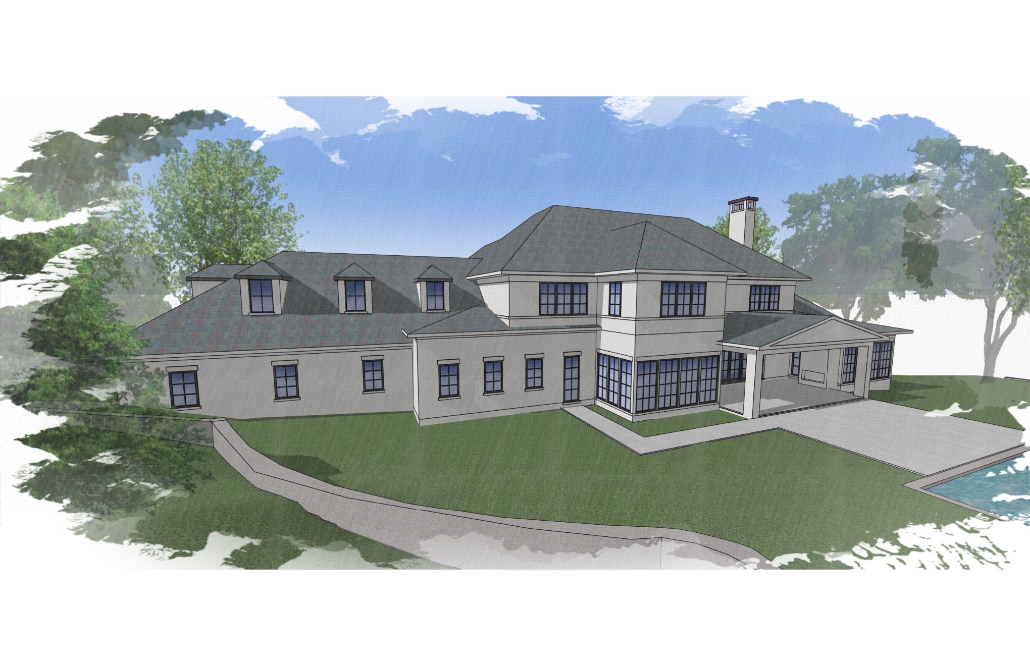 all light stucco house no stone add ultra realistic materials and vegetation keep hardscape the same as original manacured lawn with simple elegant planter beds and landscaping keeping the home as the main focus keep landscaping as the original image shows in front of you is a retaining wall not a walkway keep realistic materials looking a little cartoonish dont do that