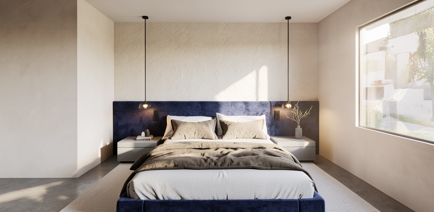 crea una imagen fotorrealista a partir de este sketchup la base y el cabecero de la cama son textura terciopelo elimina la manta encima de la cama