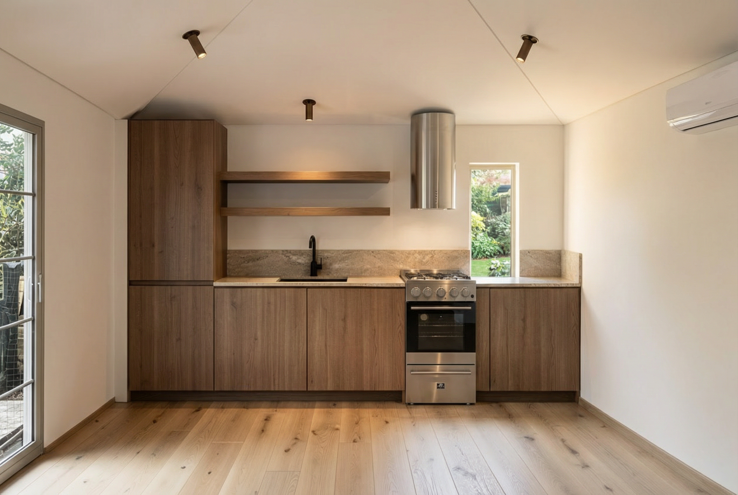 render this room in a romantic morning light make the cabinets a matte dark brown cherry warm stained wood with visible grain the trim on the cubby doors are a thin half round detail make the floors a matte brown brick in a grid pattern the back of the nook should be plaster with an a small antique abstract landscape painting in it with a red frame the cushion in the nook should be an olive green plaid the front door on the left can be a craftsman style door painted off white the walls and ceiling can be a cream pink taupe in the nook on the left there should be wood behind hanging coats above on hooks above and shoes in the cubbies below no not add any artificial lighting