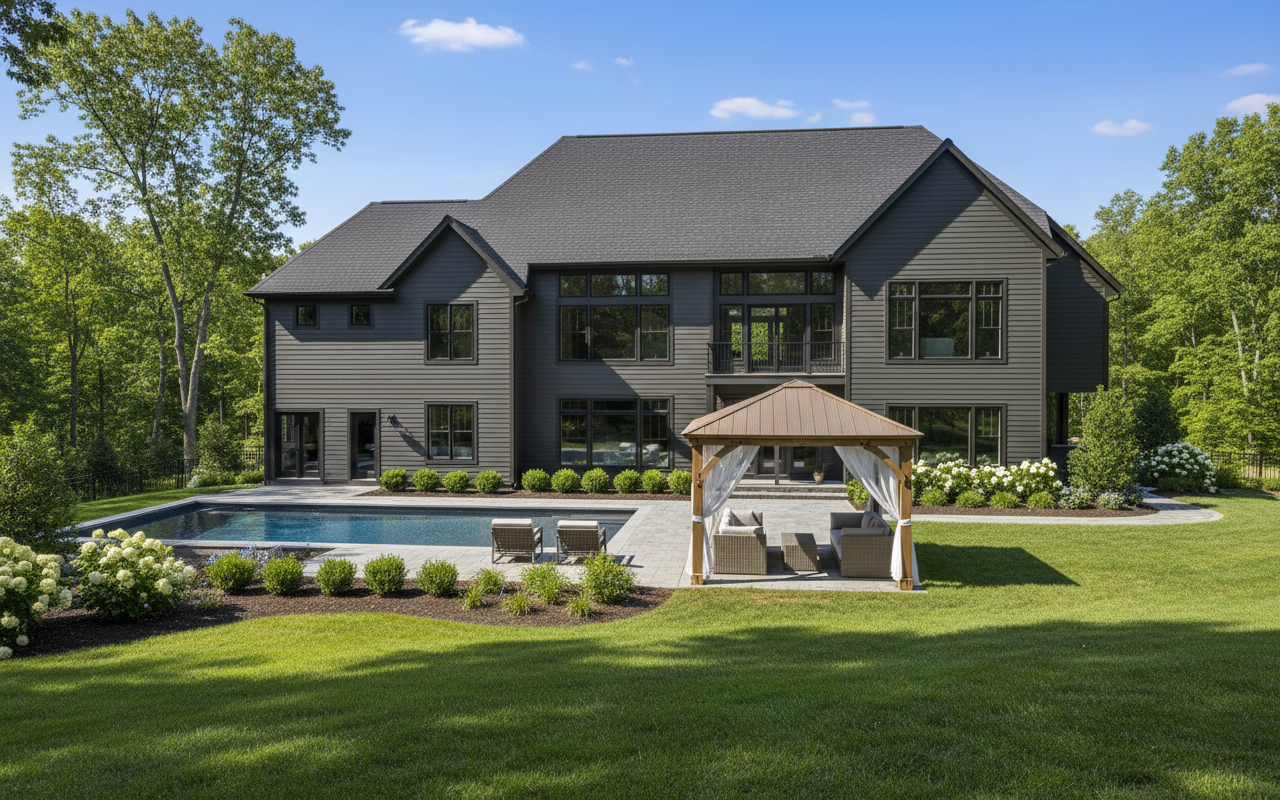 add a riverpools x36 model pool cedar gazebo with curtains add outdoor furniture make the siding iron ore paint colored no stone or brick on the house black windows do not change the layout add landscaping zoom out far to show landscaping and house make the deck all brushed concrete add dining table and chairs no steps put the gazebo to the left make it look fancy