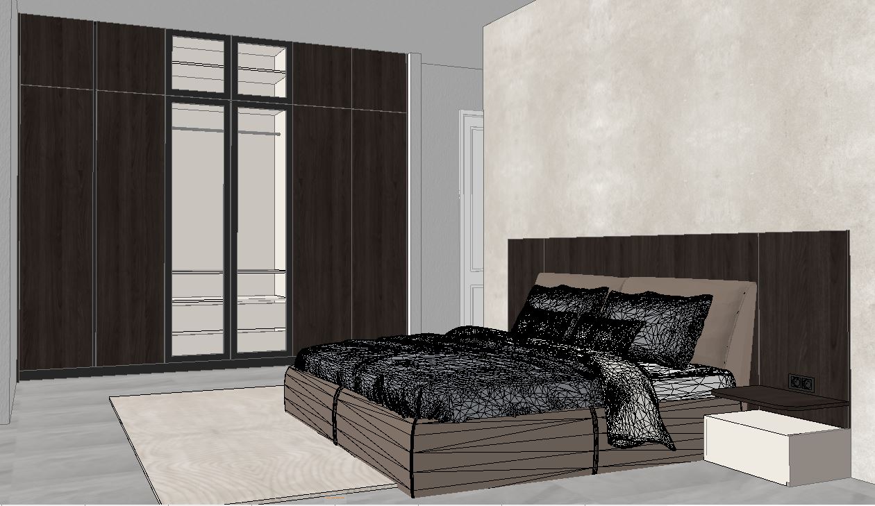 create a cozy bedroom environment featuring a modern double bed with a wooden headboard in a dark walnut color the bed is adorned with elegant black pillows and a matching blanket use a soft beige color for the bedsheet place the bed against a textured white wall on either side of the bed incorporate minimalist beige nightstands for the floor use a light gray faux wood texture to add warmth next to the bed lay a cream colored area rug with subtle wavy patterns include a large window on the right allowing natural light to flood in creating a serene and inviting atmosphere in the room