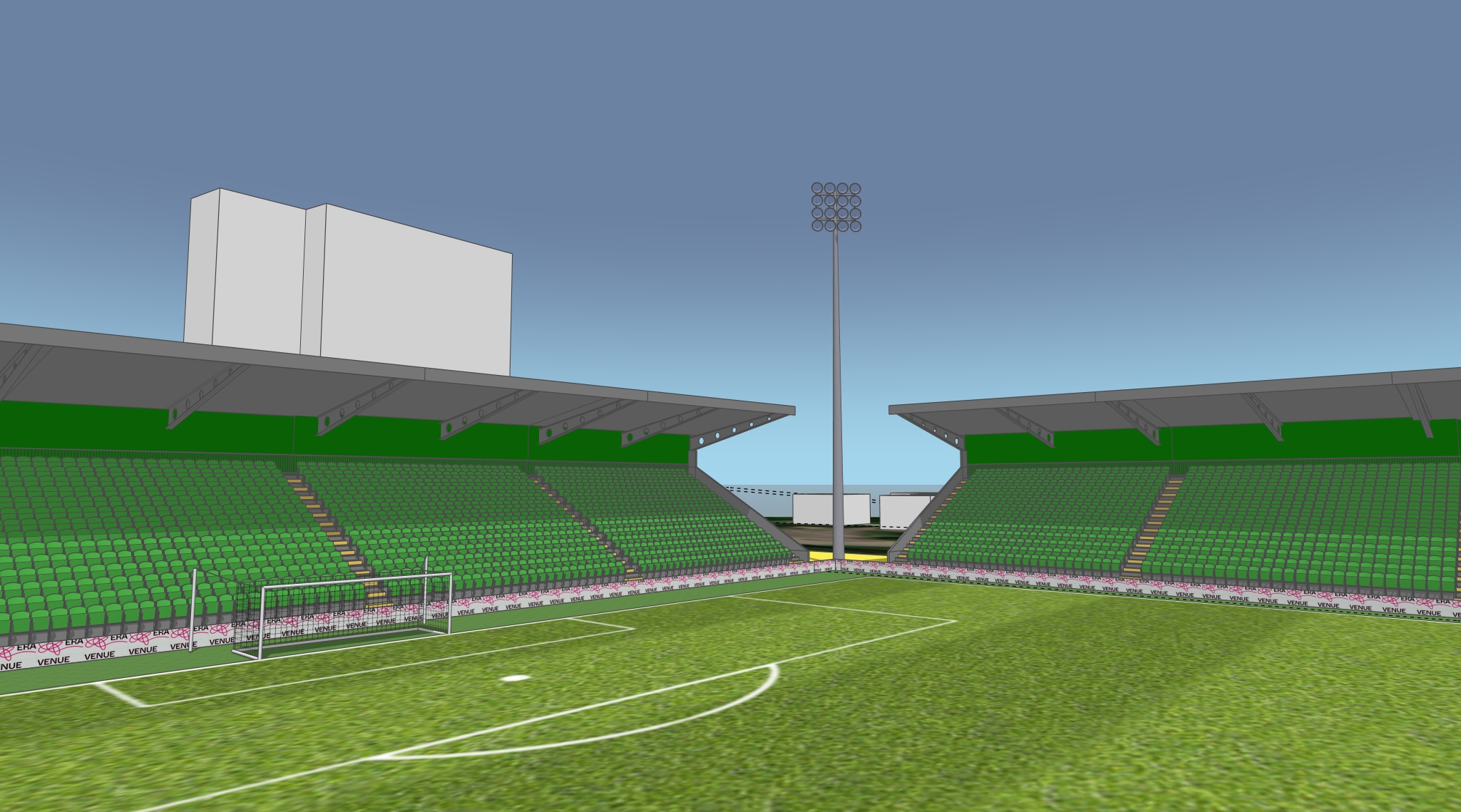 a vibrant football stadium under a clear blue sky featuring lush green grass with white field markings the grandstands have bright emerald green seats the stadium architecture is a sleek modern design with light gray structural elements the atmosphere is lively capturing the anticipation of an exciting match day