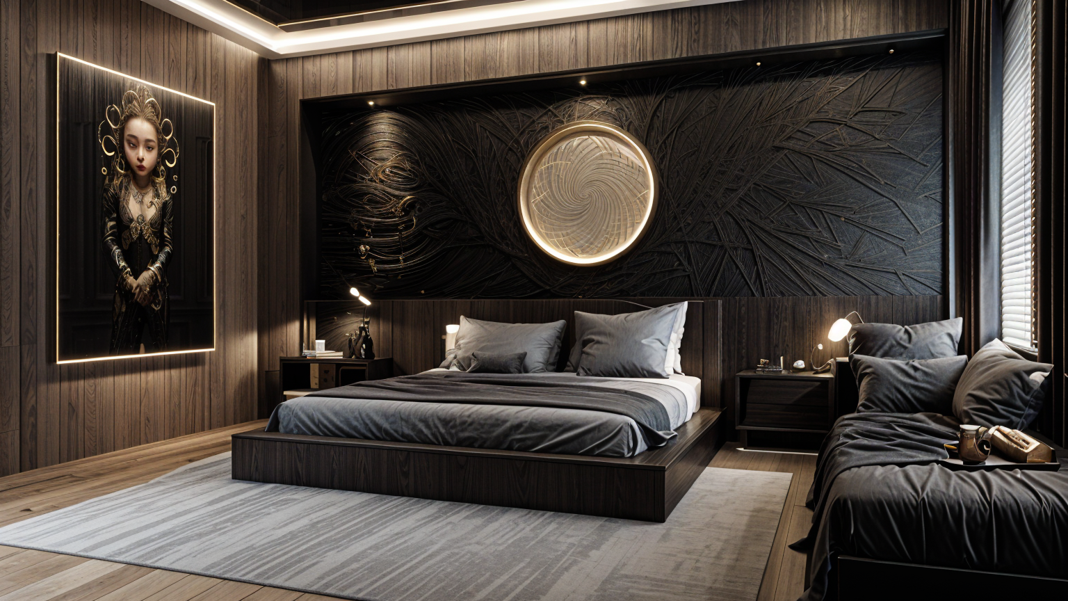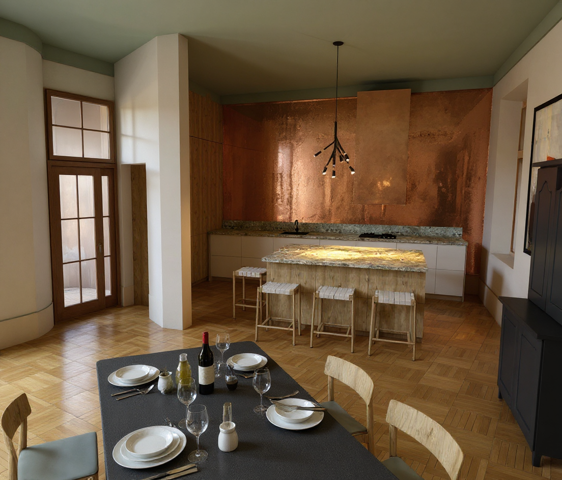 make it more photo realisti but some tableware on the table like dinner plates wine glasses bottle and make it look like a nice dinner setting not to formal though put som bottles of oil salt and pepper shakers on the kitchen island the whole back wall should be in copper as well as the kitchen fan the cieling should be the same green color as the cornice make the kitchen area a bit more lit up as daytime please even more please the wall in the back of the kitchen should be copper like tha kitchen fan but not so shiny