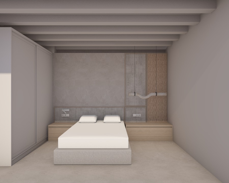 create a high end photorealistic render of a bright luxurious bedroom with a refined and expensive feel the materials should feel authentic with realistic texture the flooring is matte with a polished cement look in a sand off white shade cohesive and elegant the lighting should be warm natural and balanced add beautifully arranged high quality bed linens with soft folds and a soft aesthetic the overall mood should feel contemporary sophisticated and editorial as if photographed for a luxury interior design magazine keep the initial materials like cotton linen rattan light oak wood n the right curved s shaped pendant light made of translucent stone onyx like material with natural veining in warm beige tones cylindrical ends continuous organic wave form in the center suspended with thin black cables and brass metal brackets preserve exact shape proportions and placement enhance only material realism translucency and stone texture the headbed is cotton linen fabric on the center off white color and only on the right there is dark rattan
