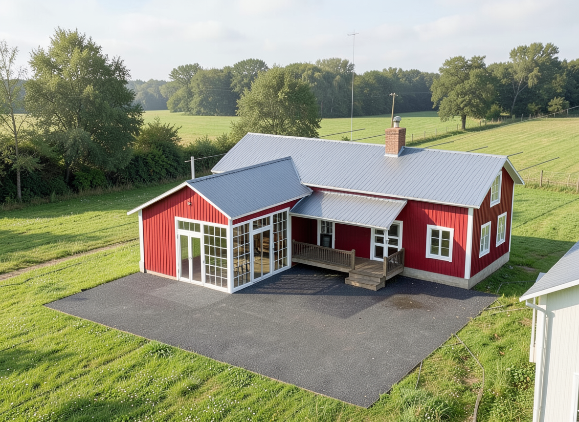 lager part of building should be red with white trim the extension with a lot of glass should have red trim roof clay tile roof