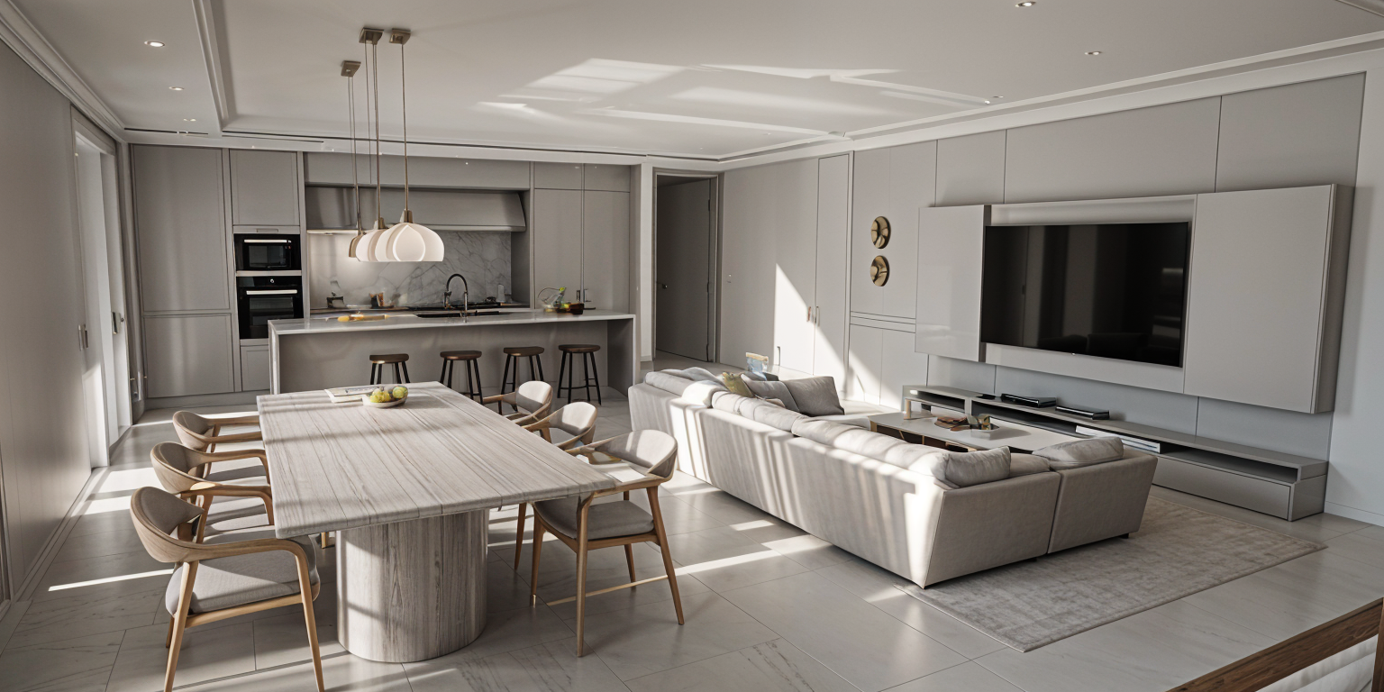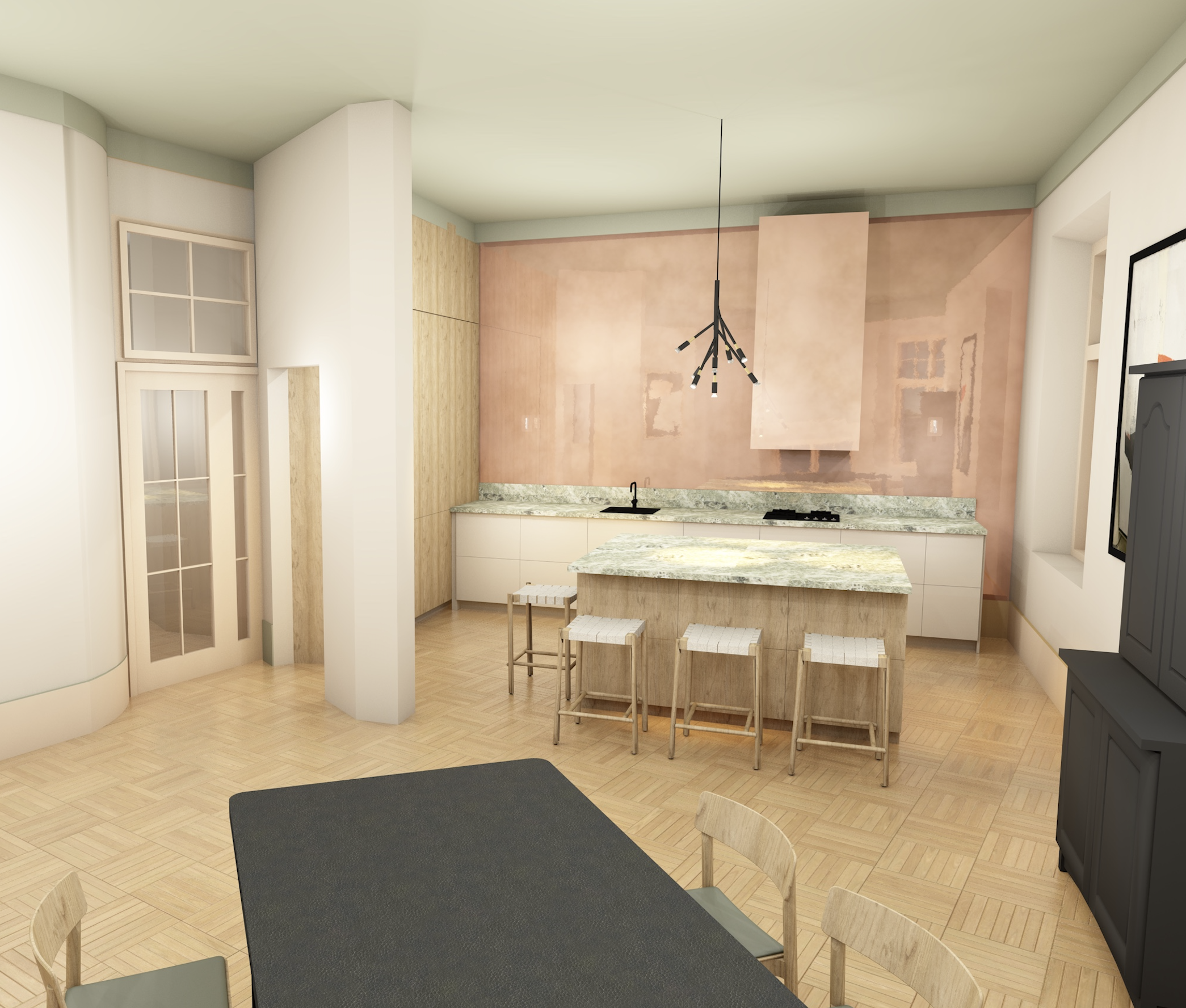 make it more photo realisti but some tableware on the table like dinner plates wine glasses bottle and make it look like a nice dinner setting not to formal though put som bottles of oil salt and pepper shakers on the kitchen island the whole back wall should be in copper as well as the kitchen fan the cieling should be the same green color as the cornice make the kitchen area a bit more lit up as daytime please even more please the wall in the back of the kitchen should be copper like tha kitchen fan but not so shiny but keep the picture bright as it is it should be daytime