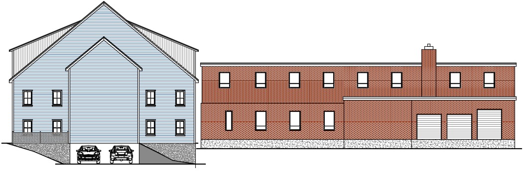 make the building on the left blue grey with black framed windows and the building on the right red brick architecture