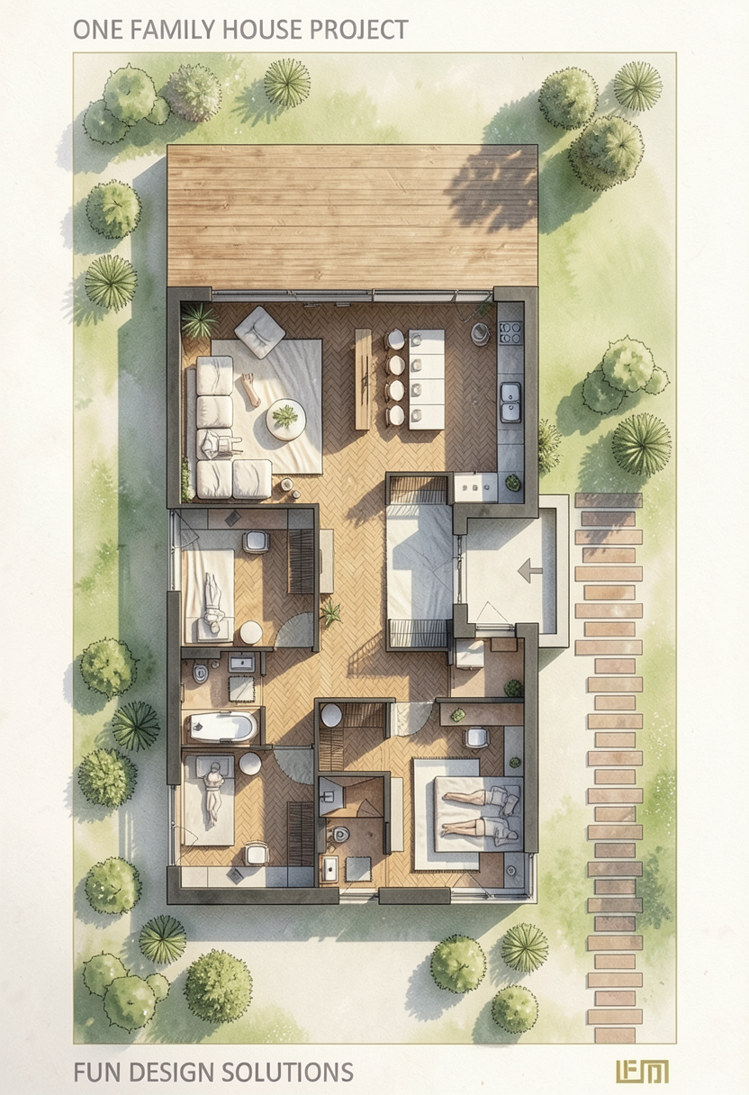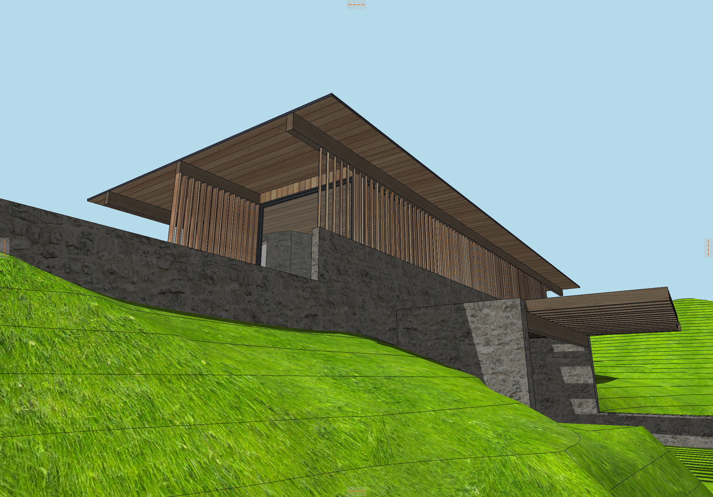 landscape hillside with sagebrush and tall wild grasses brown drystack stone walls light coming through the vertical wood louvers add a person walking under the pergola on the lower level
