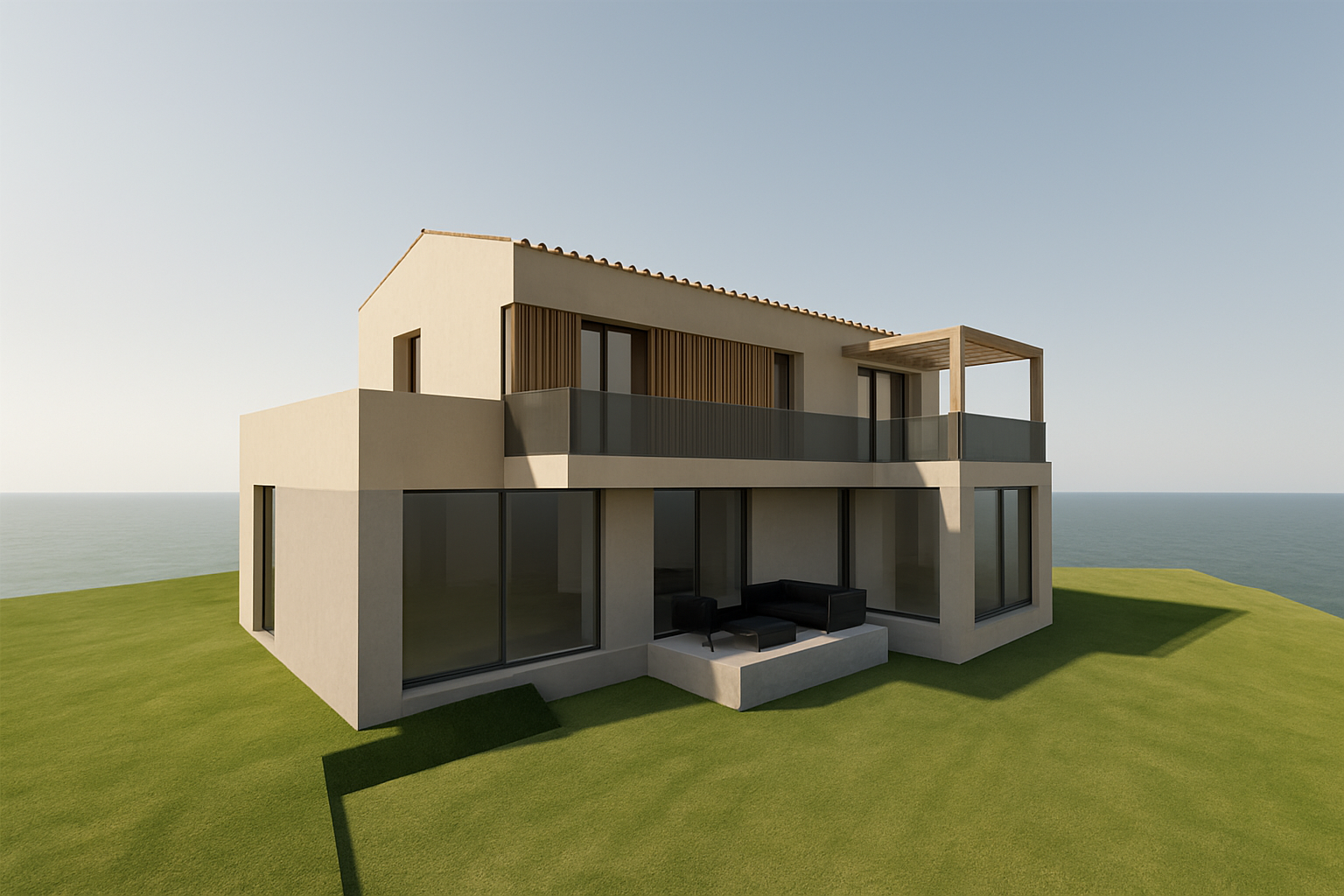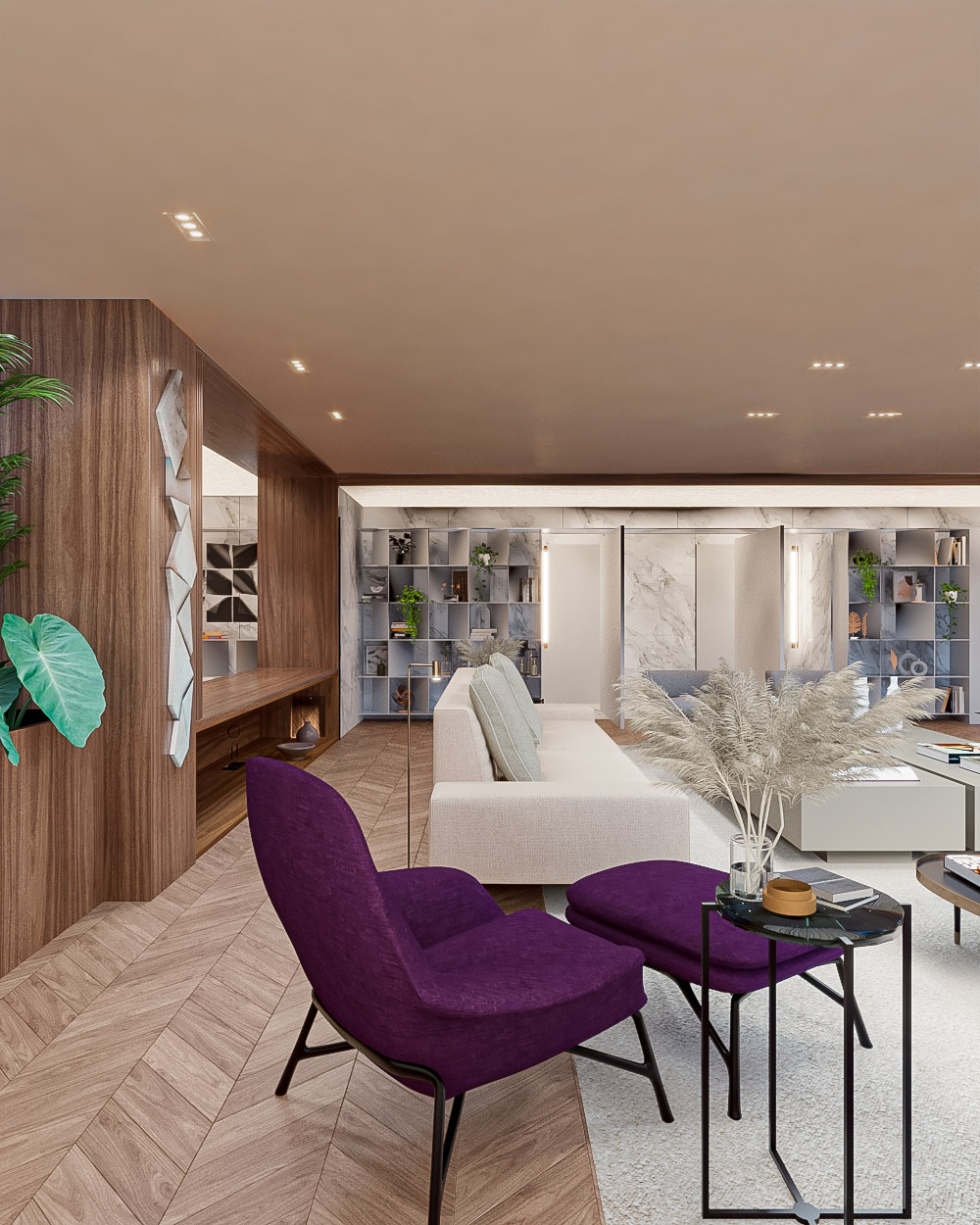 enhance realism of this interior render without changing the architecture furniture materials layout colors or artwork keep the same camera angle and composition improve natural daylight to create a warm sunny daytime atmosphere with soft shadows increase material detail realistic fabric texture on the chairs natural wood grain on the herringbone floor subtle reflections and veins on the marble surfaces and soft ambient occlusion in corners add slight daylight bloom near the windows maintain a clean elegant contemporary aesthetic add a casually dressed couple standing naturally near the dining area interacting softly with each other without drawing too much attention add a medium sized friendly dog calmly sitting or lying on the floor integrated into the scene lighting and perspective the couple and the dog should look realistic natural and well lit and should fit harmoniously into the environment