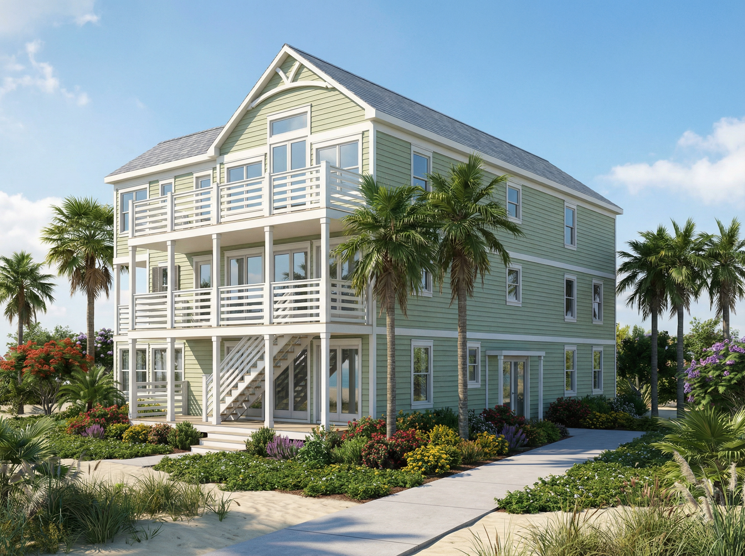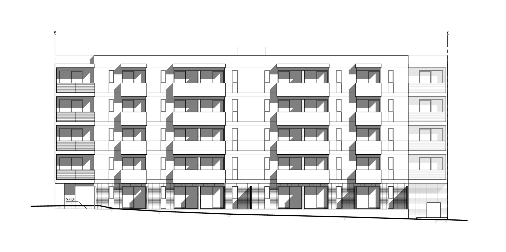 le corbusier exterior shot generate a high quality photorealistic architectural rendering based on a two dimensional elevation drawing the project is a multi story urban apartment building the ground floor is clad in warm terracotta brick with the same terracotta brick used as paving and flooring surrounding the building at grade creating a continuous material base upper levels are finished entirely in white materials including smooth matte white plaster stucco siding white framed windows and white metal balconies with clean minimal detailing the building is contemporary and urban in character with clear articulation between the brick base and lighter upper volumes the scene is set on a bright sunny day with soft natural shadows blue sky and realistic daylight reflections include subtle urban context realistic proportions and accurate material textures render from a slightly angled street level perspective to emphasize depth massing and material contrast ultra realistic lighting architectural visualization quality high resolution architecture