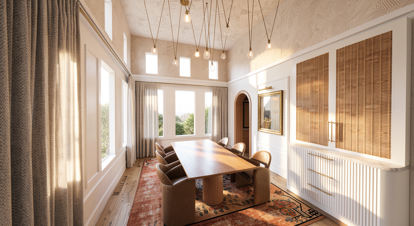 a serene architectural landscape featuring a rustic estate with multiple charming buildings the main house exhibits black roofs with cream white walls accented by dark brown windows and doors adjacent structures display a harmonious mix of natural wood finishes and dark stone textures adding depth and contrast the roofs are uniformly black enhancing the elegant aesthetic the paved paths are a gentle beige harmonizing with surrounding lush green lawns rustic wooden fences outline the property adding to the tranquil atmosphere the entire scene is bathed in soft warm sunlight casting gentle shadows for a peaceful inviting vibe