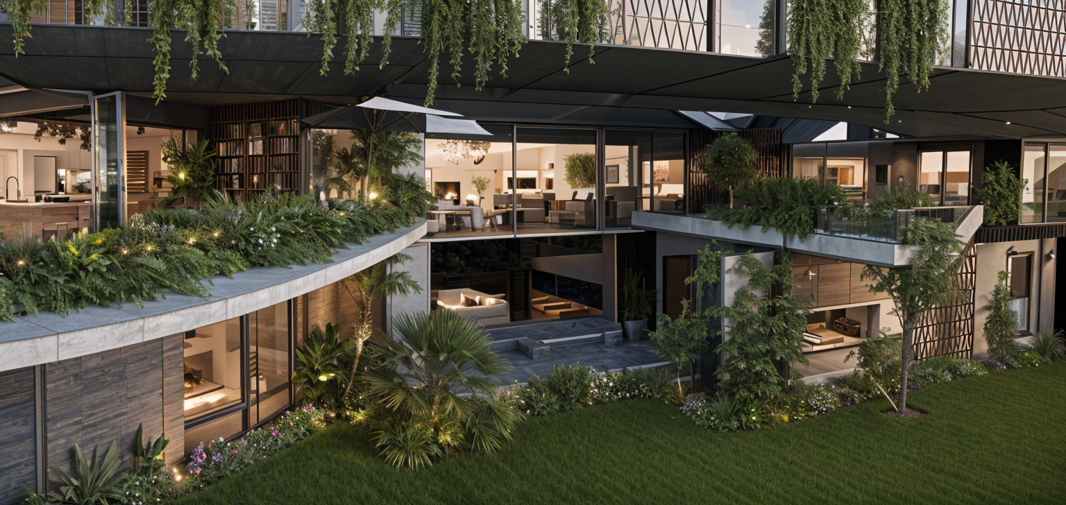 modernist perspective shot use nature coziness and greenery set in the evening with soft gentle sunlight put a stair in the middle circular architecture