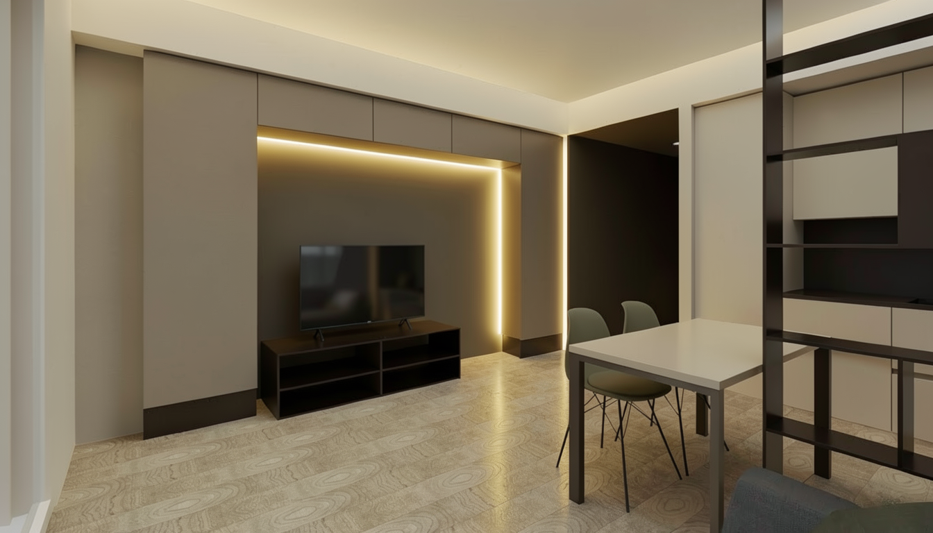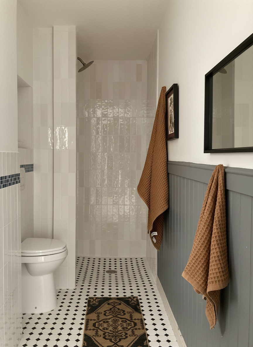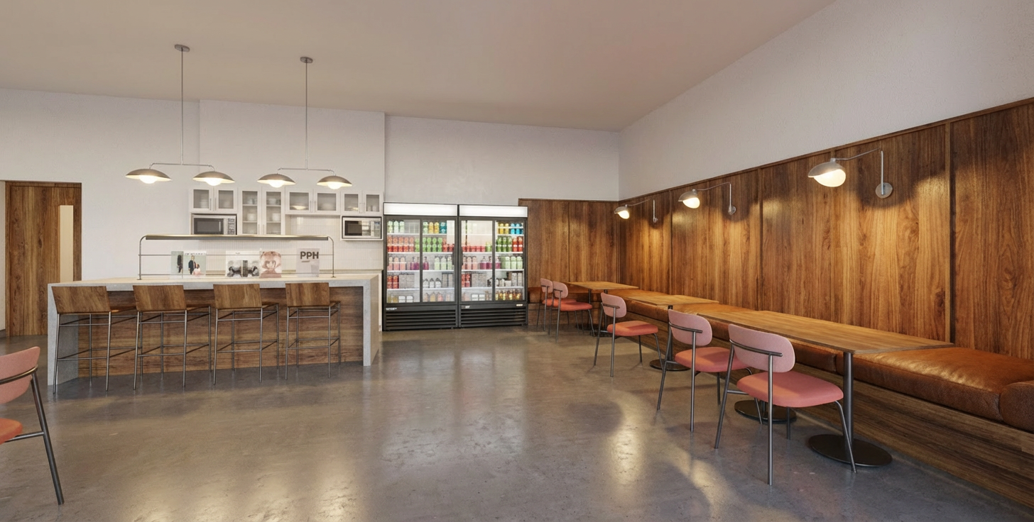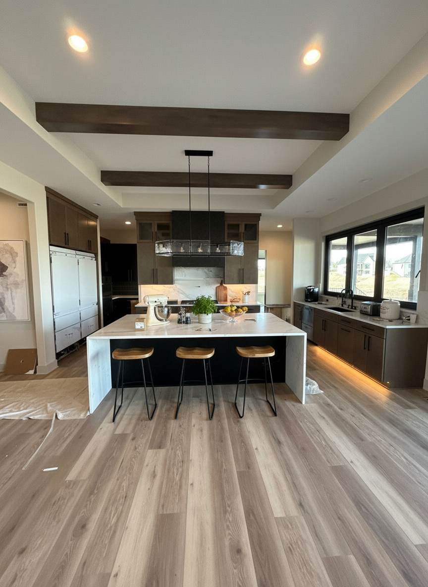 24 x 48 stagger grey tile floors matching leather bolster pillow on banquette seating centre of wood panels to be cork lights to be powdered blue solid cabinet doors