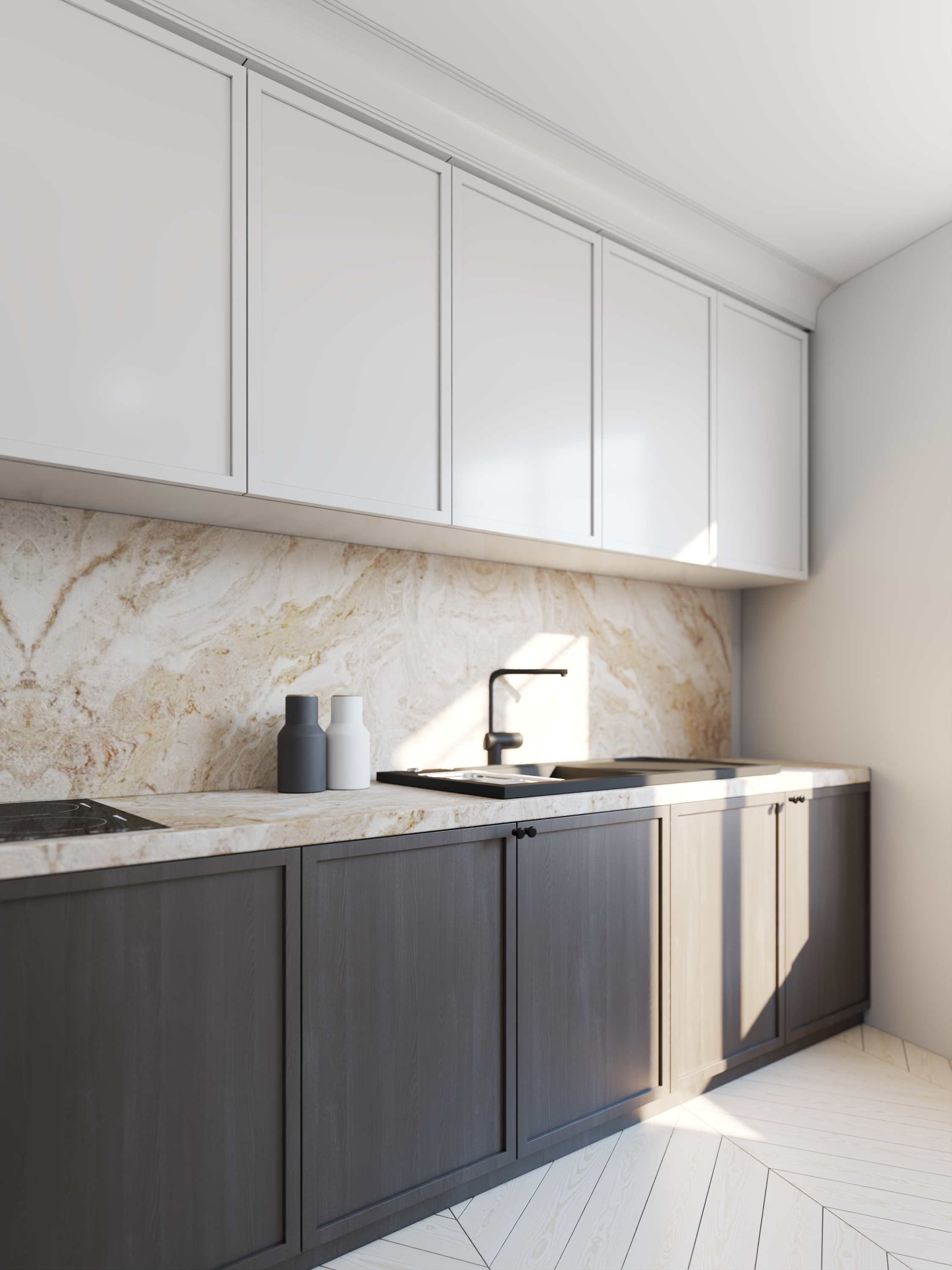 enhance the photo realistic texture and morning lighting set the interior lighting of the kitchen with soft artificial lighting setting under and upper the cabinet enhance the realistic texture and dawn lighting with interior lighting turned on with soft light set the camera focus into f 35 focus on the table set