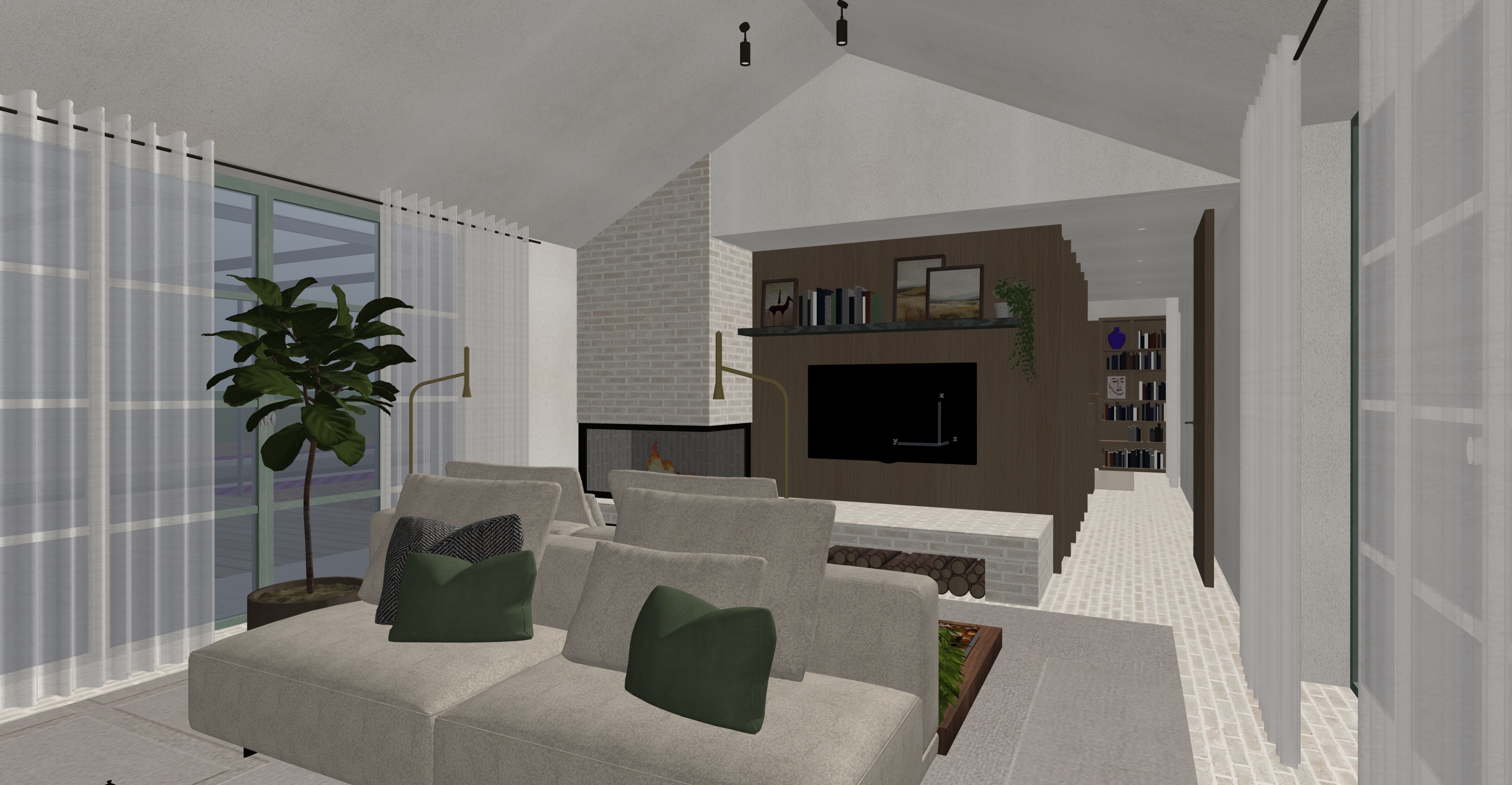 mantieni oggetti e colori immagine fai entrare luce solare dalle finestre a sinistra e destra accendi luci legno rovere chiaro come texture accendi tv accendi tv su netflix accendi camino accendi piantane in ottone satinato mensola sopra tv in marmo verde mantieni texture scena