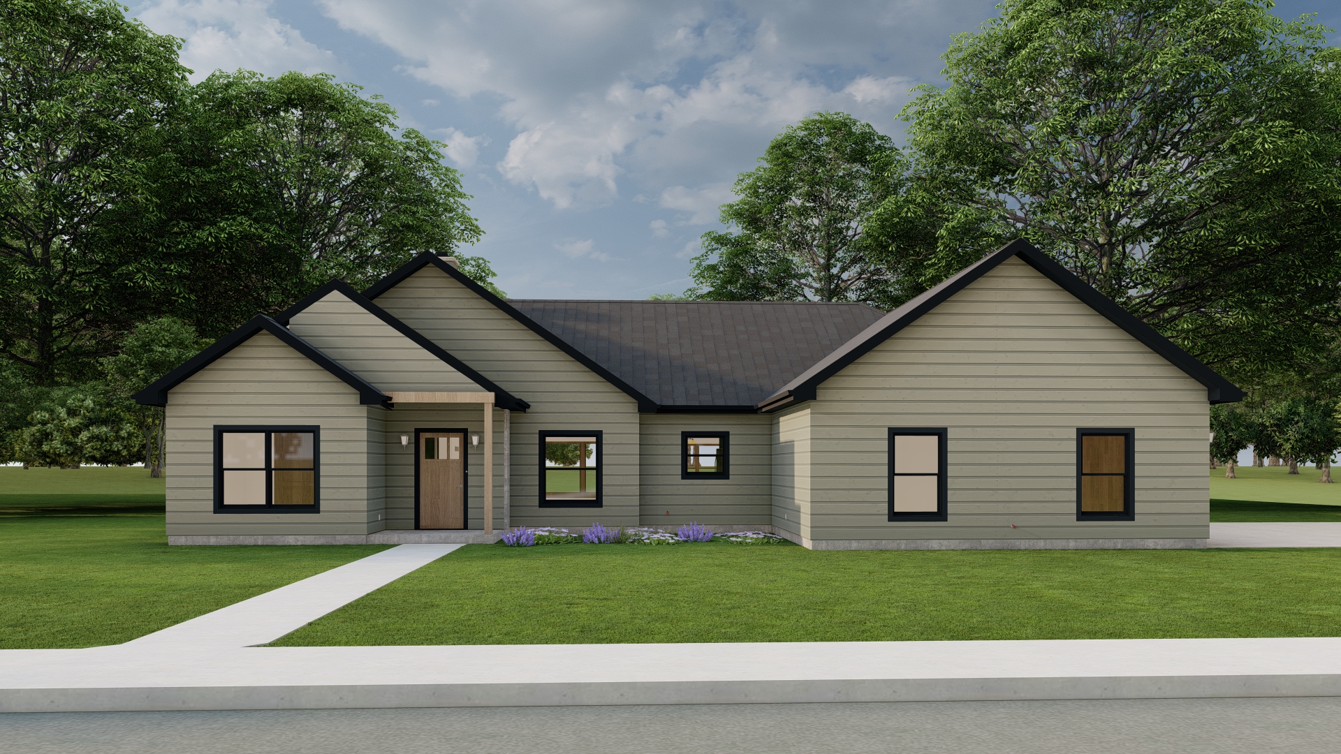 make this a realistic rendering of a house on a sunshine day with the lights faintly on in the windows the siding is a sage green lap siding