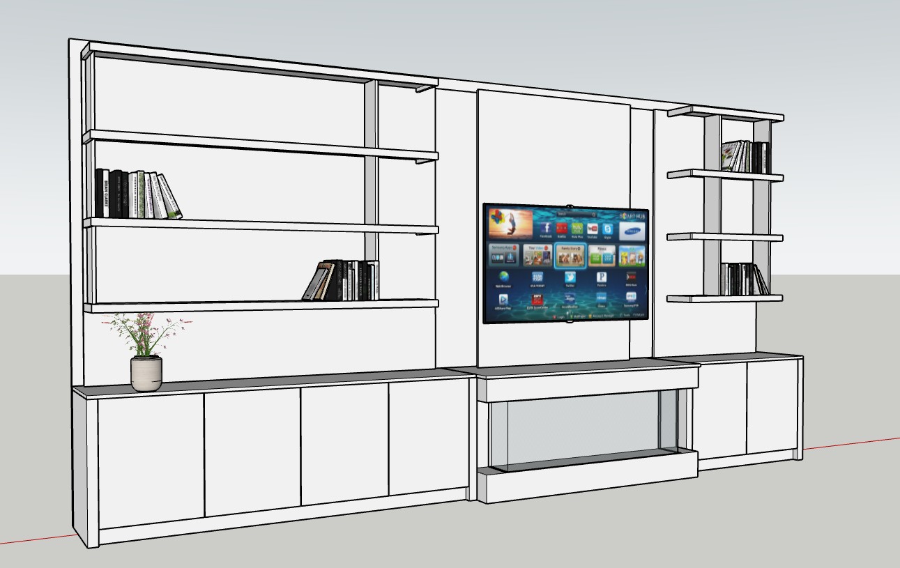 this is a sketchup drawing of a tv media wall it is finished in a cream colour there is a three sided electric fire and a 55 tv keep all dimensions exactly as they are in the sketchup drawing and render as a photo real picture with led lighting around the entire unit and around the board that the tv is mounted on