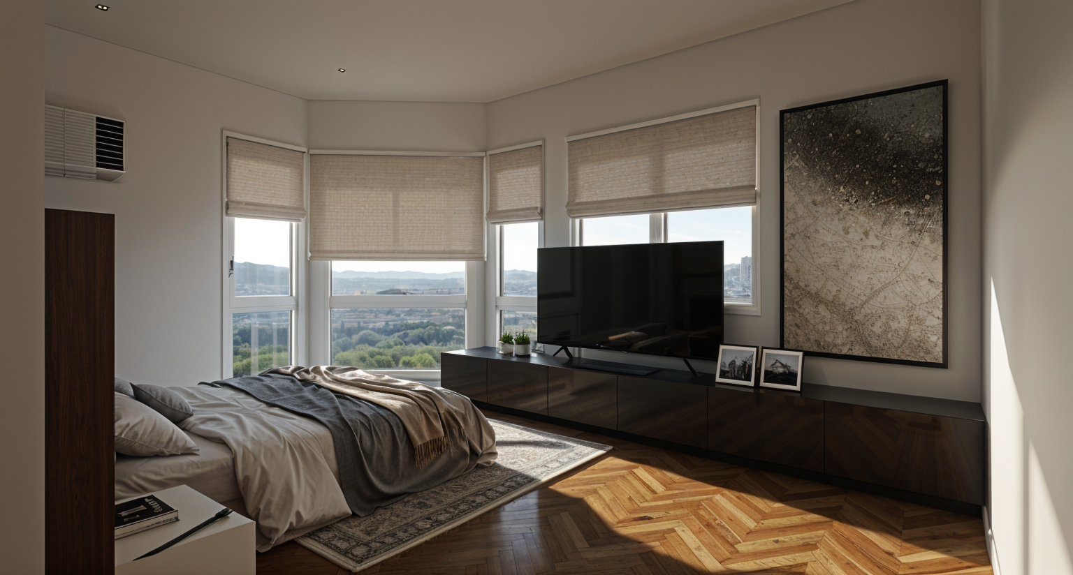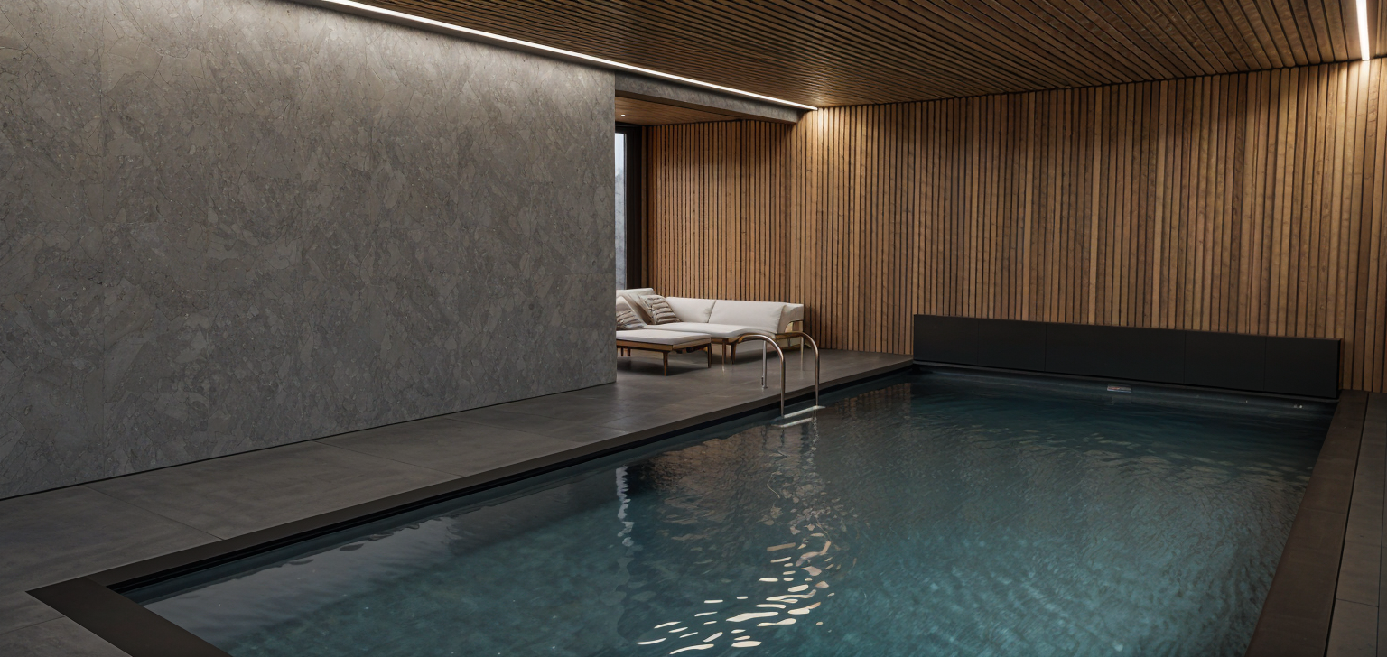 render a modern luxurious house with large glass windows reflecting a clear blue sky use sleek white tones for the concrete structure warm wooden accents for the decking and fence add vibrant green plants in sleek planters for a touch of nature the atmosphere is serene and elegant with soft sunlight casting gentle shadows creating an inviting tranquil ambiance