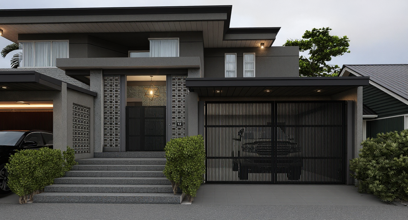 dark brown roof big stone limestone cladding classic lights exterior black garage door with glass panels dark wood main door dark window trims offwhite stucco
