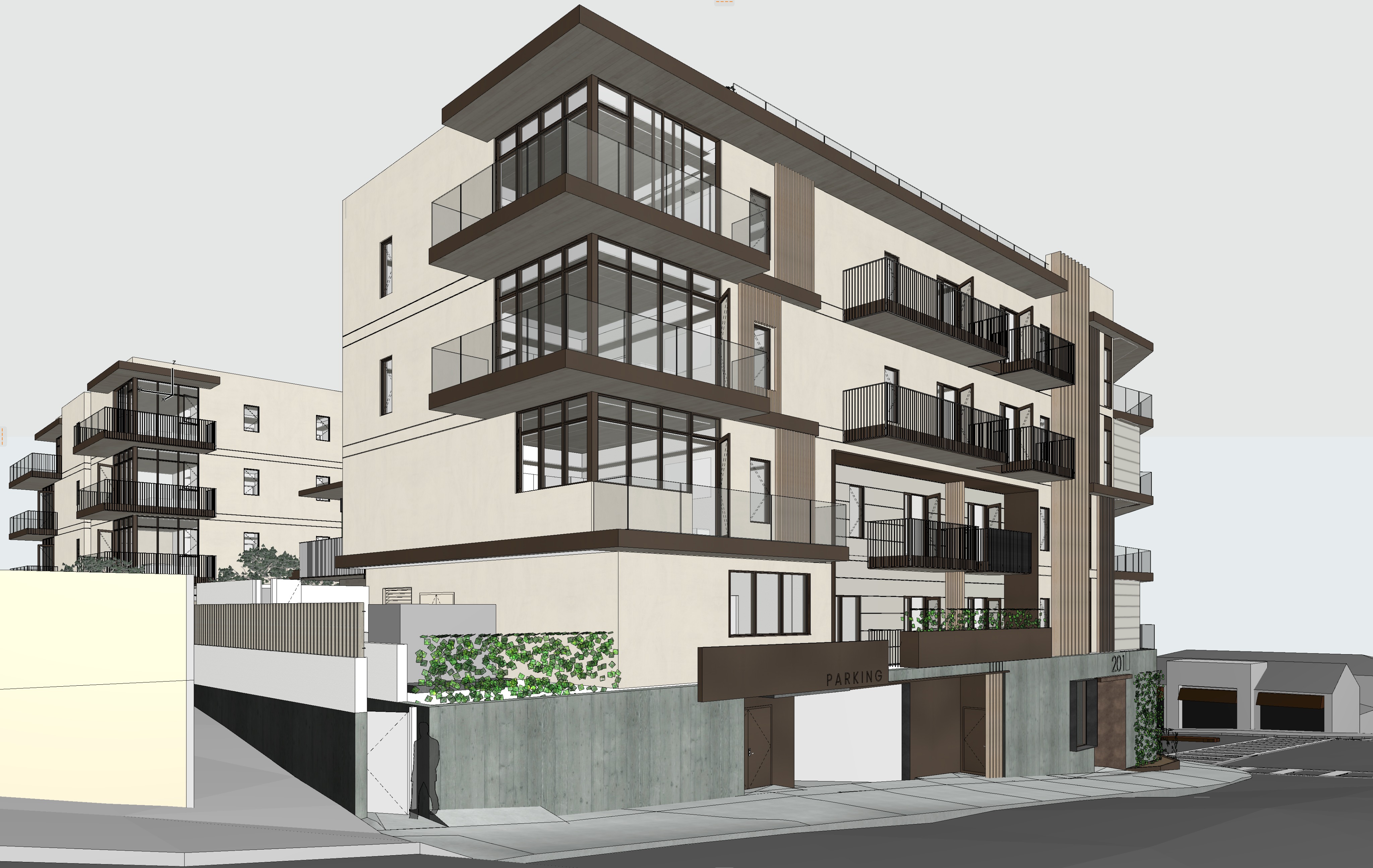 do not change the architecture at all smooth trowel stucco with light sand color light board form concrete building base vertical wood slats horizontal metal panel at recessed walls siding in light beige color slightly darker than stucco dark brown metal railings and horizontal fascia do not change the architecture at all clear day