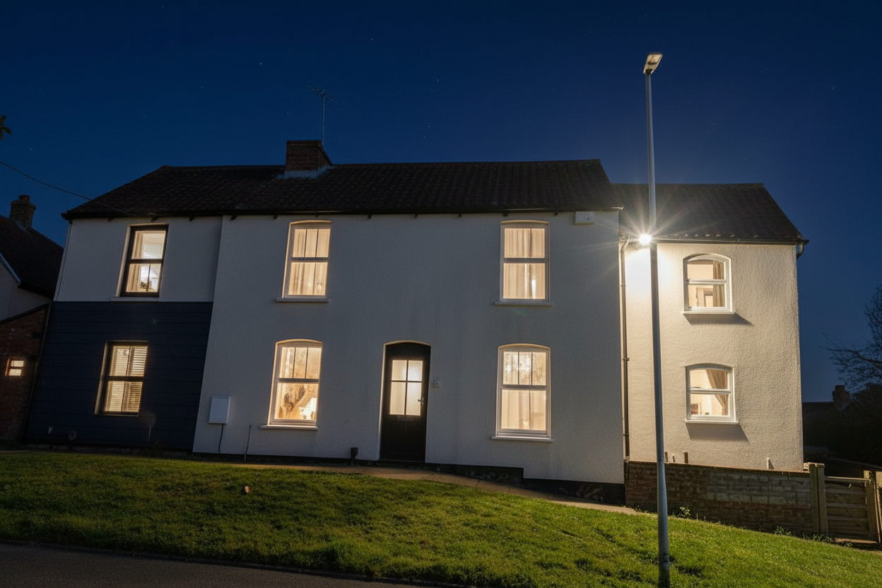 make the door completely dark with no light remove the eaves light add a moon in the sky make the street light glow keep everything else the same as the source image