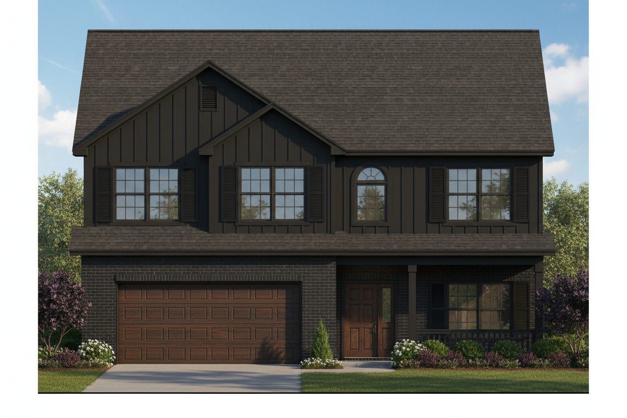 render this 3d image to appear photo realistic maintain all existing architectural materials and structural elements exactly as shown enhance the setting with a lush well maintained landscape include minimal garden beds manicured shrubs and a tree lined backdrop that frames the home naturally the windows should have a glossy finish with clear reflections of the surrounding trees and sky lighting should feel natural with soft shadows and realistic depth to bring the scene to life