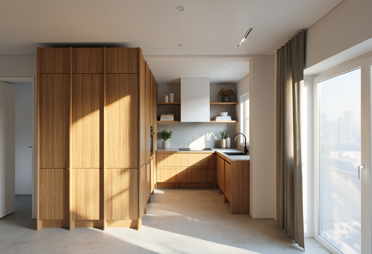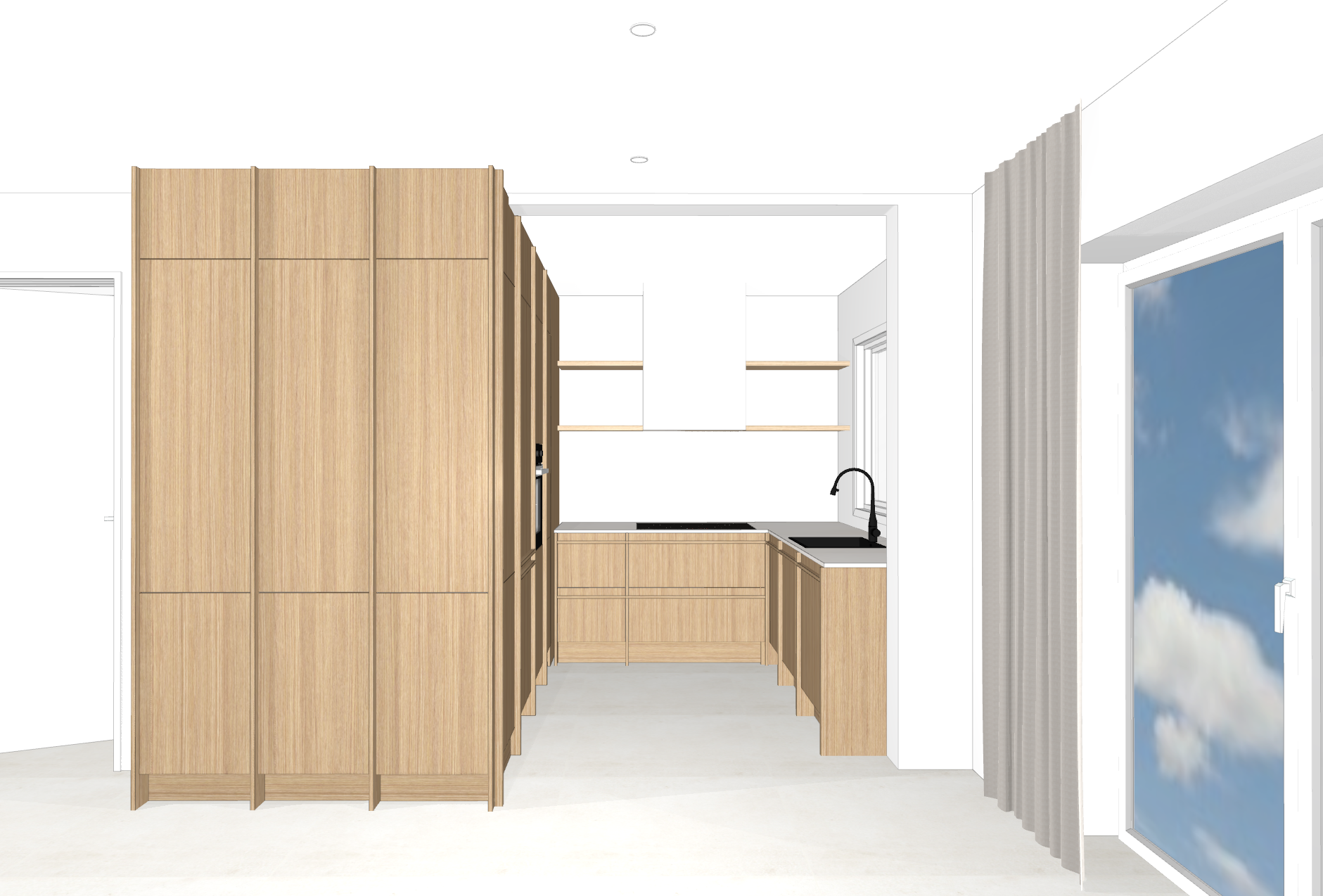 orangy plain oak cabinets with a light off white cemented worktop and backsplash running up to the shelf add some decor and dynamic light the windows look out to a patio giving way to the garden