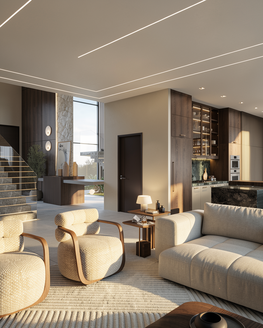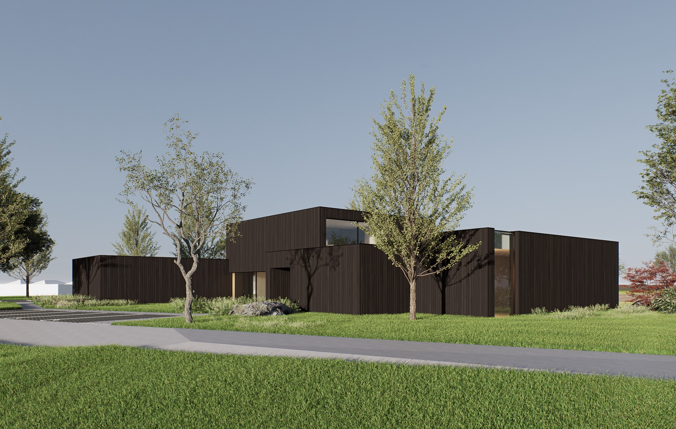 enhance the realism of this architectural visualization while strictly preserving the original geometry volumes proportions and composition do not change shapes layout camera angle or perspective improve material realism with physically accurate textures pbr add realistic lighting with natural global illumination soft shadows ambient occlusion and accurate reflections refractions introduce lifelike environmental details such as natural sky lighting slight atmospheric depth and realistic colours maintain the original framing and scene structure exactly as is focus on photorealism high dynamic range and cinematic quality without modifying the design keep the building in the dark black burned wood texture