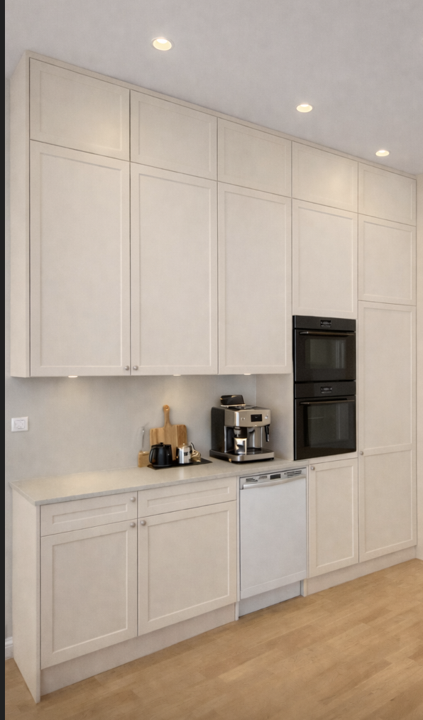 render a modern kitchen with a sleek and minimalist design the cabinets should be painted in a soft cream color with subtle panel detailing the countertop should be a light gray complementing the cabinets above the counter place a stainless steel coffee machine black electric kettle and wooden cutting boards adding a touch of warmth the double ovens should be in a matte black finish seamlessly integrated into the cabinetry ensure the dishwasher is stainless steel the walls should be a light beige enhancing the bright atmosphere the floor should be a warm light wood color adding a cozy feel soft recessed lighting should illuminate the space with a warm glow creating an inviting and clean ambiance