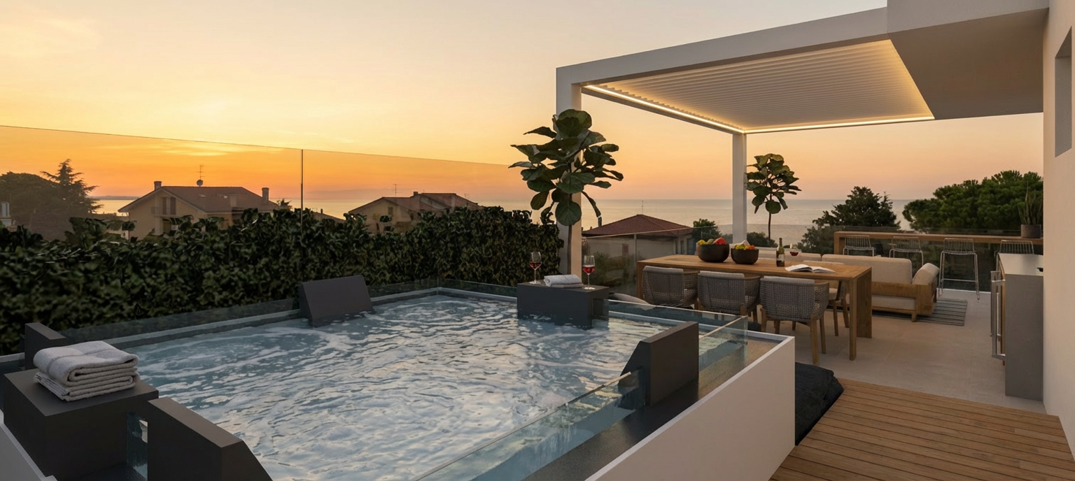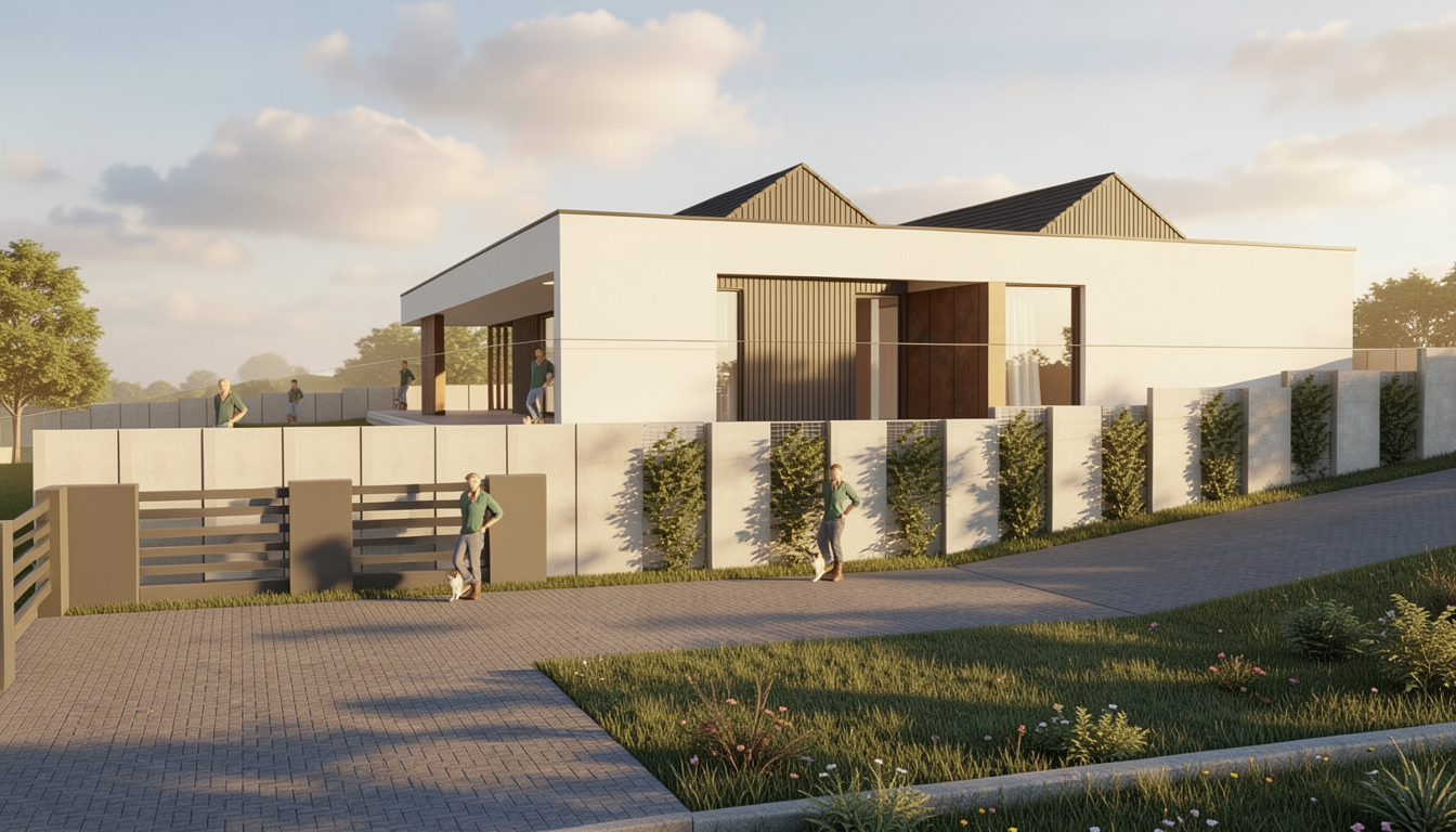 model of a house add very few trees in far far background for context add few vegetation with very very few floral ones for context should look lived in put a short hedge in the further left side of house