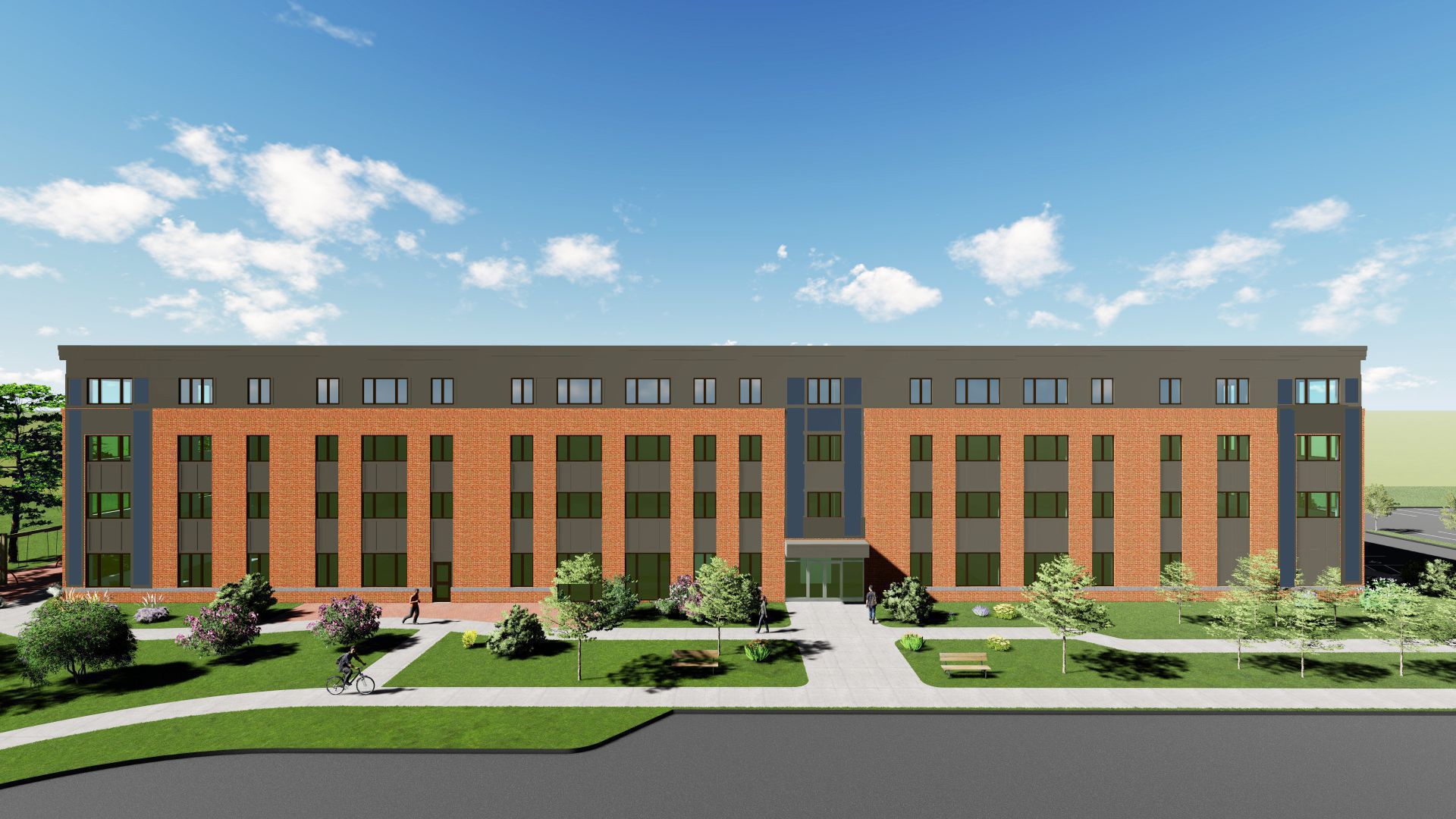 create twilight rendering from this image with illuminated windows with sunset light on this south elevation