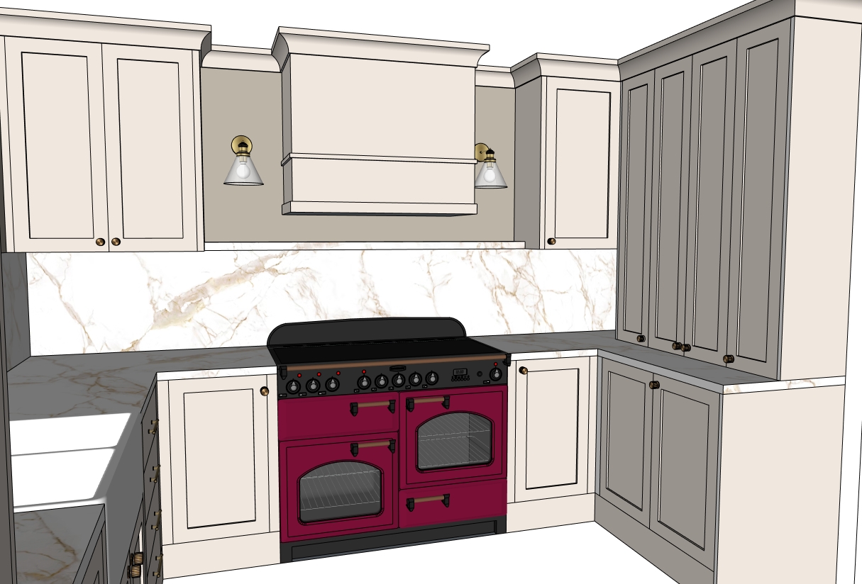 interior shot create a realistic and beautifully rendered kitchen interior the cabinets are painted in a soft cream color exuding elegance and warmth incorporate a luxurious marble backsplash with subtle white and light gray veining the stove is a striking deep burgundy adding a bold yet sophisticated touch include brass fixtures for the faucet and light sconces enhancing the overall richness ensure the countertop is a marble finish providing a refined contrast the atmosphere should be warm and inviting with soft natural light streaming through the window for a cozy yet upscale feel