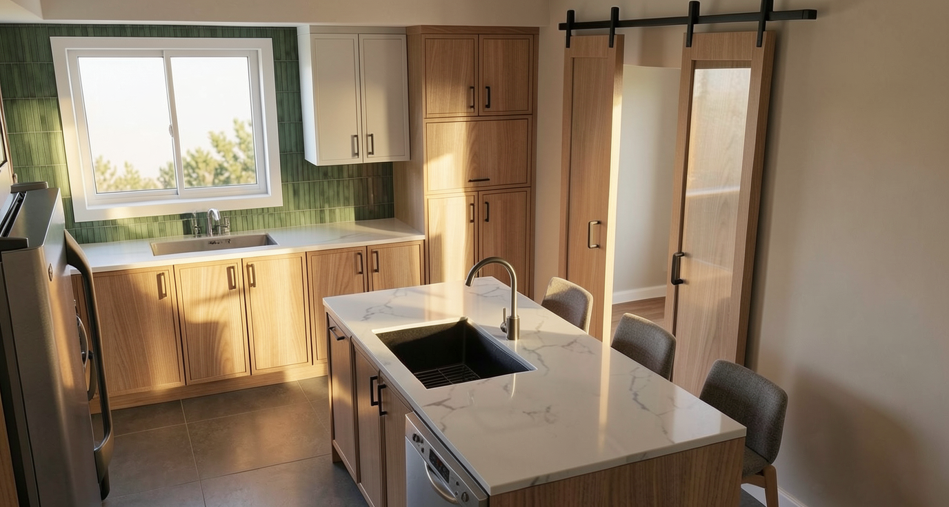 a mountain modern home made from the following materials dark brown wood siding white stacked stone veneer dark gray aluminum fascia and hinted blue see through glass windows add landscaping around the exterior of the home using different colored green bushes and flowers change the grass to be more wild resembling a semi arid utah environment change the background to look more realistic using trees and dirt add different patio furniture along with potted plants to be the patio more color add furniture on the inside add a warm whiteish light illuminating from the interior windows