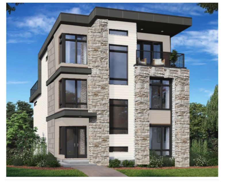 a new modern home that has two tones of siding stacked stone highlights and dark trim details 3d photorealistic perspective rendering architectural