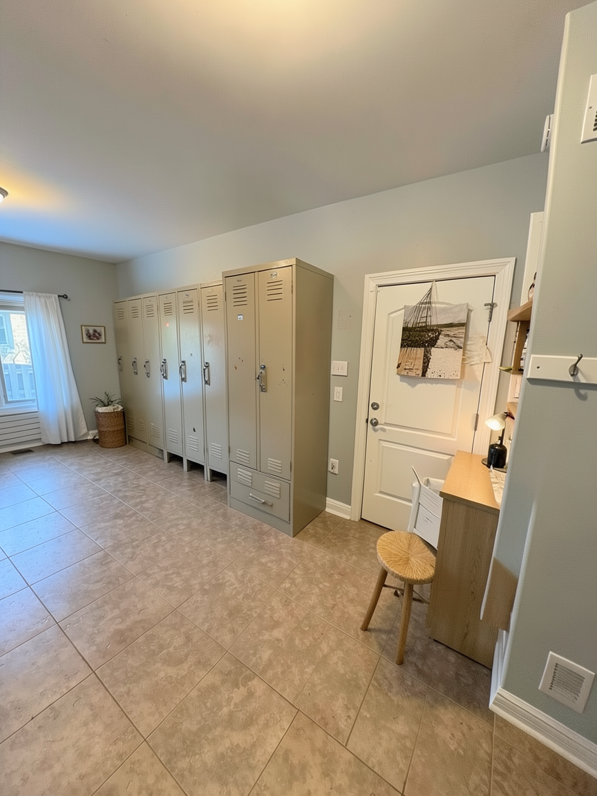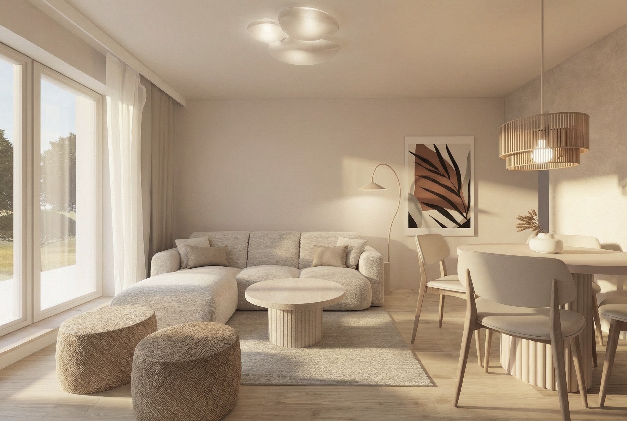 render a cozy minimalist living room bathed in warm natural sunlight design the room with a soft cream colored sofa and matching ottoman include a light wooden floor and an elegant round coffee table in a muted natural tone position two textured beige poufs near the window adorned with flowing sheer white curtains incorporate a soft beige area rug under the sofa and coffee table add a modern floor lamp with a subtle light brown stand and shade beside the sofa decorate the wall with abstract art featuring earthy tones of brown and black position a round dining table with light wooden chairs in the dining area and hang a woven rattan pendant lamp above the atmosphere should feel serene and inviting