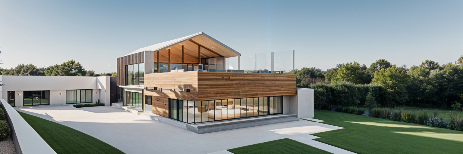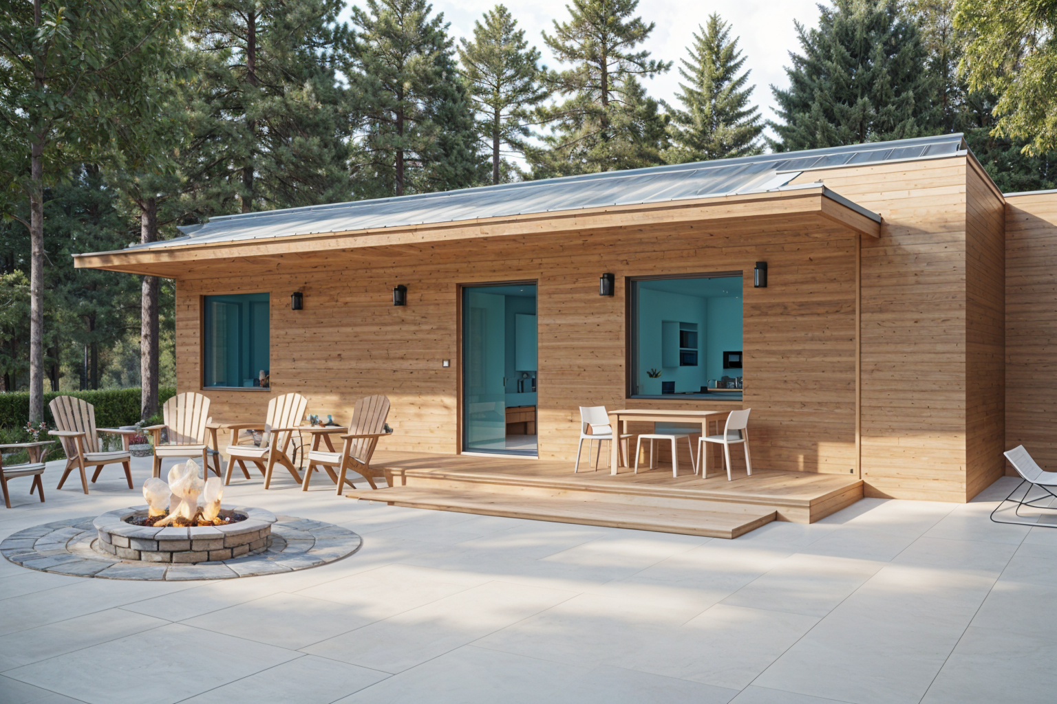 modernist exterior shot single story cabin in forest setting with wood plank siding and modern metal roof architecture