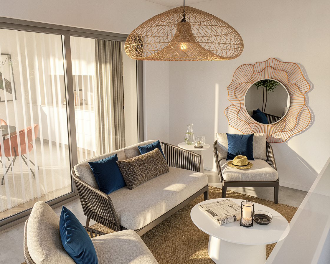 zona cucina con piano in marmo venato e una strip led sotto i pensili l isola della cucina ha una lampada a sospensione cromata ed accesa gli sgabelli sotto all isola sono cromati le pareti sono tinteggiate di bianco sopra al divano abbiamo quattro faretti ad incasso accesi che illuminano i quadri i faretti sono due per ogni quadro a fianco dei quadri abbiamo una lampada a parete bianca accesa dietro al divano la boiserie bassa in legno rovere naturale ha una strip led incassata nella parte superiore che emette luce verso l alto metti una strip led dentro alla veletta in cartongesso sopra alla tenda leggera fai entrare un p di luce naturale dalla portafinestra e metti uno sfondo di un terrazzo con delle piante e vista mare in lontananza fai entrare della luce naturale anche alle spalle dell immagine metti qualche oggetto di una zona cucina