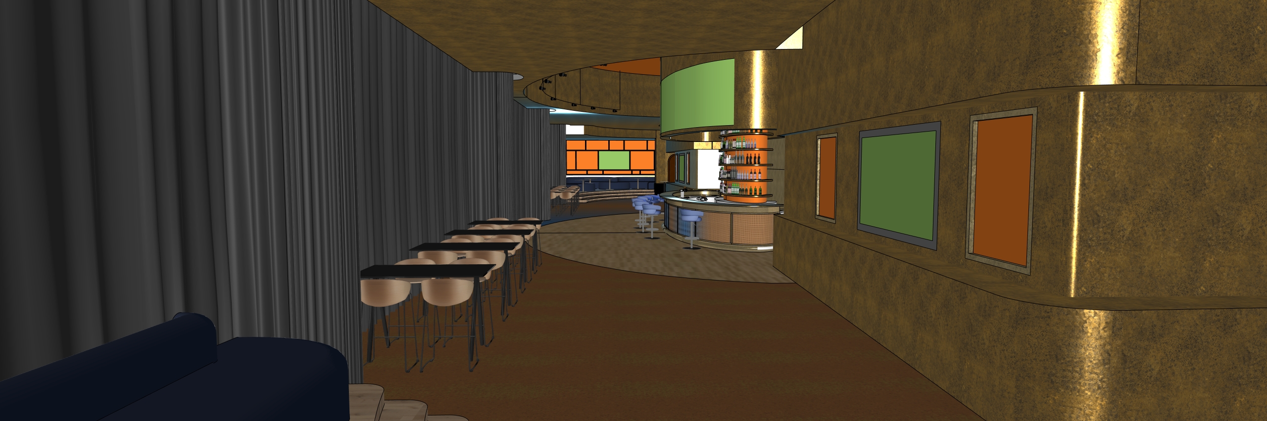 photorealistic render strict reference mode this render must be generated from the provided sketchup 3d image as an absolute reference the ai must exactly replicate the original geometry volumes proportions architecture spatial layout and all elements visible in the source image without any interpretation or optimization this project represents a high end classy reception lounge located inside a football stadium the space must remain exactly as designed with no stylistic reinterpretation of any kind the ai is strictly forbidden from reinterpreting the design enhancing or improving materials adding or removing any objects adding decorative elements adding furniture adding televisions screens lights bottles accessories or props unless explicitly requested changing textures finishes or patterns or stylizing surfaces in any way only what is explicitly stated in this prompt is allowed everything else is forbidden all wall floor and ceiling textures from the sketchup image must be preserved exactly as they are the ai must not recolor materials replace materials with gold metallic glossy or golden textures reinterpret materials homogenize textures or stylize and simplify surfaces in any way textures must be rendered in a realistic high quality way but without any modification of their nature color or finish the color coding system present in the reference image must be fully respected the warm and golden ambiance must come exclusively from artificial lighting interaction never from material changes the floor contains two clearly distinct material zones that must be preserved exactly with no unification no blending and no homogenization under any circumstances the first zone covers the entire main corridor and high table seating area it is a poured acoustic flooring of type boulenger altopex warm medium dark brown in tone smooth and matte with a seamless finish and no joints no tiles no visible pattern this zone must not be replaced with wood tiles stone marble or any patterned material the second zone covers only the circular area surrounding the bar counter it is a pvc plank flooring with a wood look pattern of type forbo sarlon trafic warm beige and sand in tone light with a subtle wood grain plank texture and semi matte finish with realistic visible plank joints this zone must not be replaced with carpet stone or any hard seamless flooring the boundary between these two zones must be sharp and strictly faithful to the reference image there is no natural light in this render there is no sunlight no daylight no skylight no exterior light and no exterior influence of any kind the space must read as a fully enclosed interior with zero exterior illumination all lighting must be one hundred percent artificial any openings windows or colored shapes visible in the reference image must not emit light must not glow and must not suggest any exterior brightness artificial lighting must be warm soft and indirect enhancing volumes and depth without overexposure the atmosphere must feel elegant controlled premium and realistic all furniture visible in the sketchup image must be kept exactly as is no furniture may be added removed or modified no new screens tvs lights shelves or objects may be added anywhere in the scene the color coded shapes visible in the reference image must be interpreted strictly as follows every orange colored shape regardless of its form rectangular curved or concave must be replaced by a realistic mirror this includes the two framed rectangular orange panels embedded in the right wall the rectangular orange panel on the back wall behind the bar and the curved orange shape on top of the central cylindrical bar volume no other surface may become a mirror every green colored shape must be replaced by a television screen displaying a live olympique de marseille football match this includes the large green rectangle on the front face of the central cylindrical bar volume the green rectangle on the right wall between the two orange panels and the green rectangle at the back left on the bar wall no additional screens may be added anywhere else in the space the final render must contain no people no implied elements no artistic interpretation no design freedom and no additions beyond what is explicitly stated in this prompt the output must be photorealistic clean elegant and strictly faithful to the original sketchup design with all materials textures and layout preserved exactly as provided under artificial lighting only
