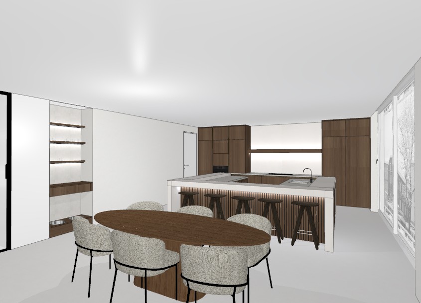 japandi inspired kitchen with wallnut cabinets and creme seamless microcement worktop add decor