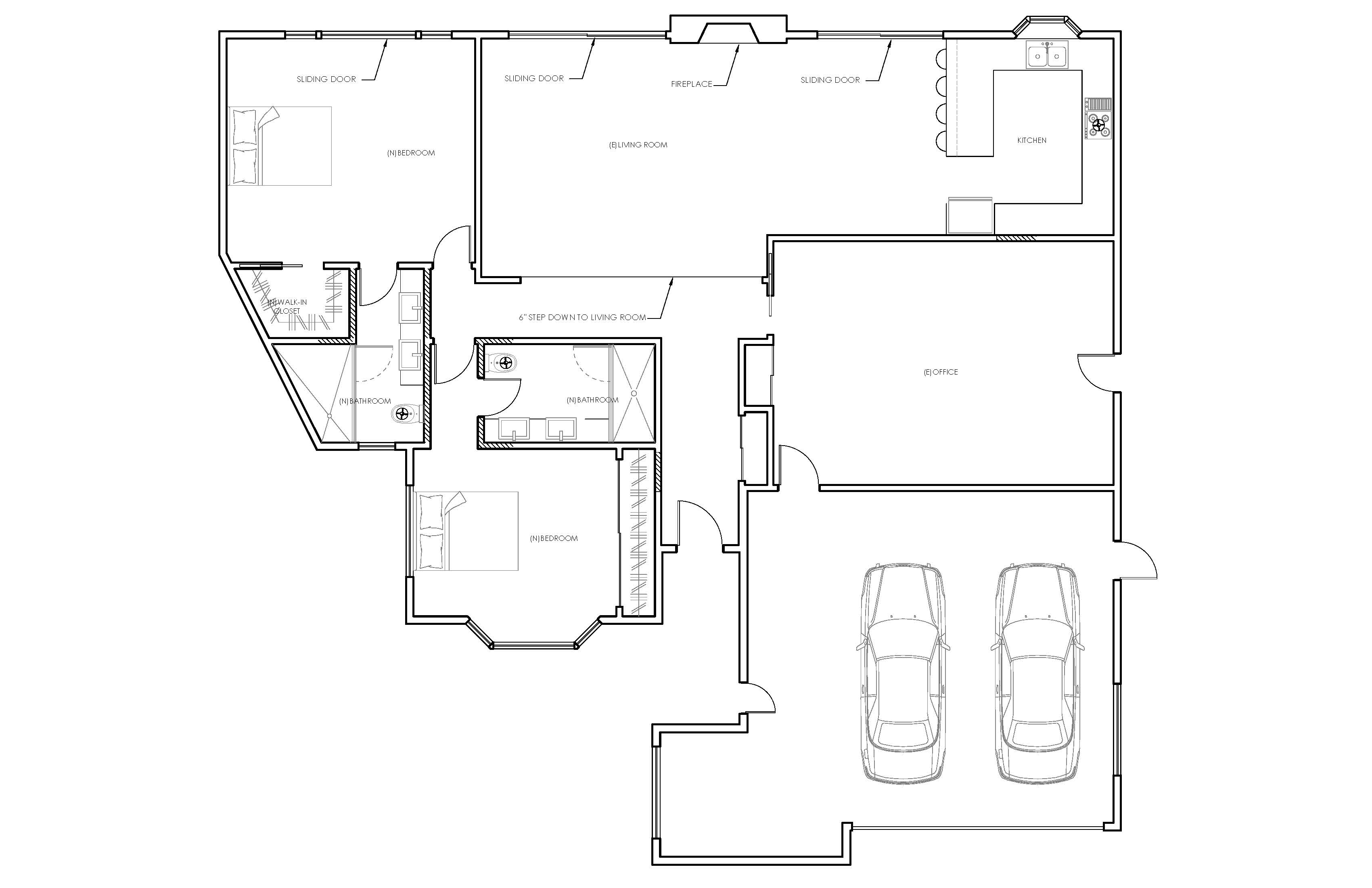 convert this floor plan into a realistic isometric 3d view of a full house show the space from an elevated angle with furniture walls and details visible modern furniture and material tile in bathrooms laminate flooring bedrooms and kitchen concrete garage floor concrete pavers outside the house use the same furniture as shows on the plan do not change the orientation of the floorplan