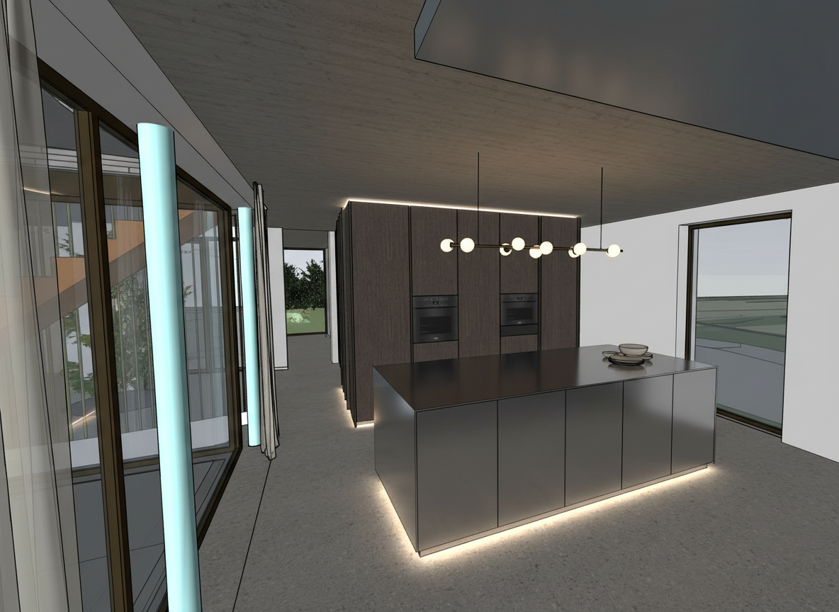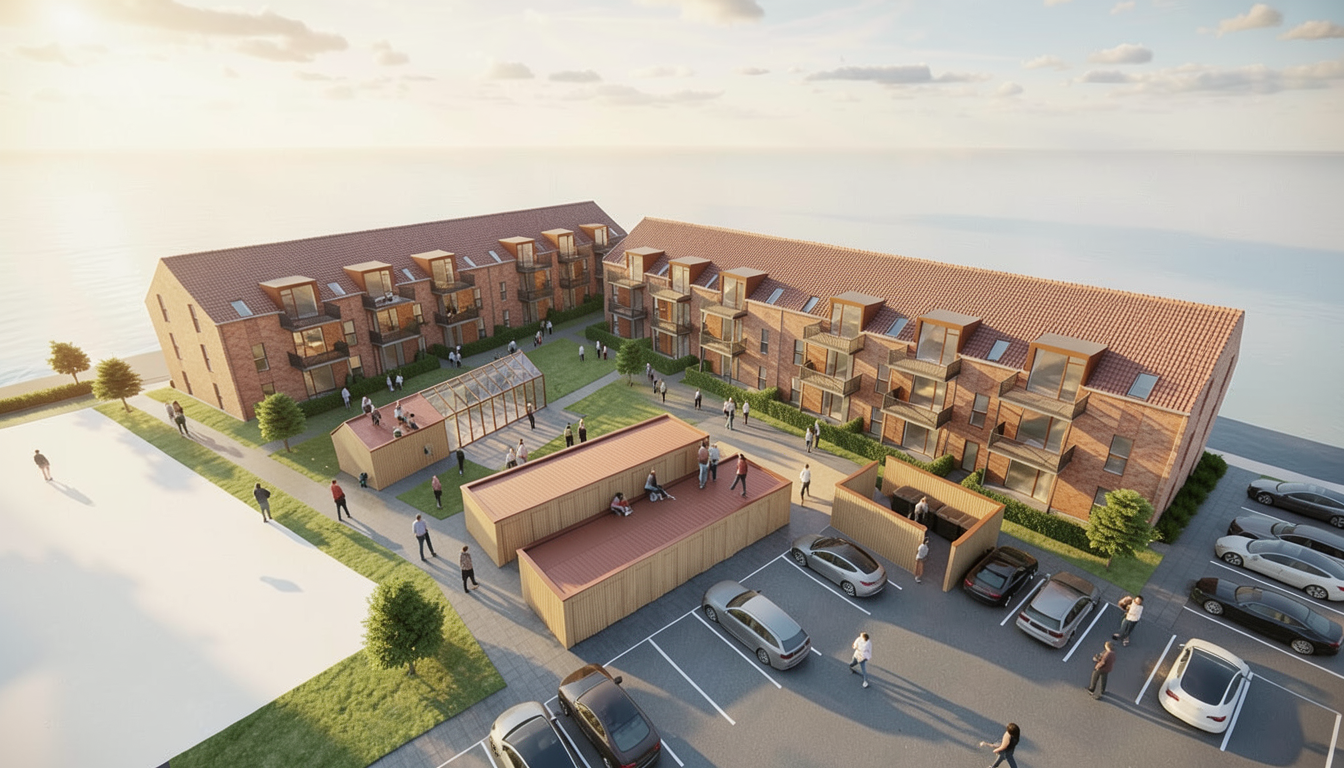 use the provided enscape render as base reference keep exact layout proportions and camera angle do not change lighting add a few people on paths and balconies