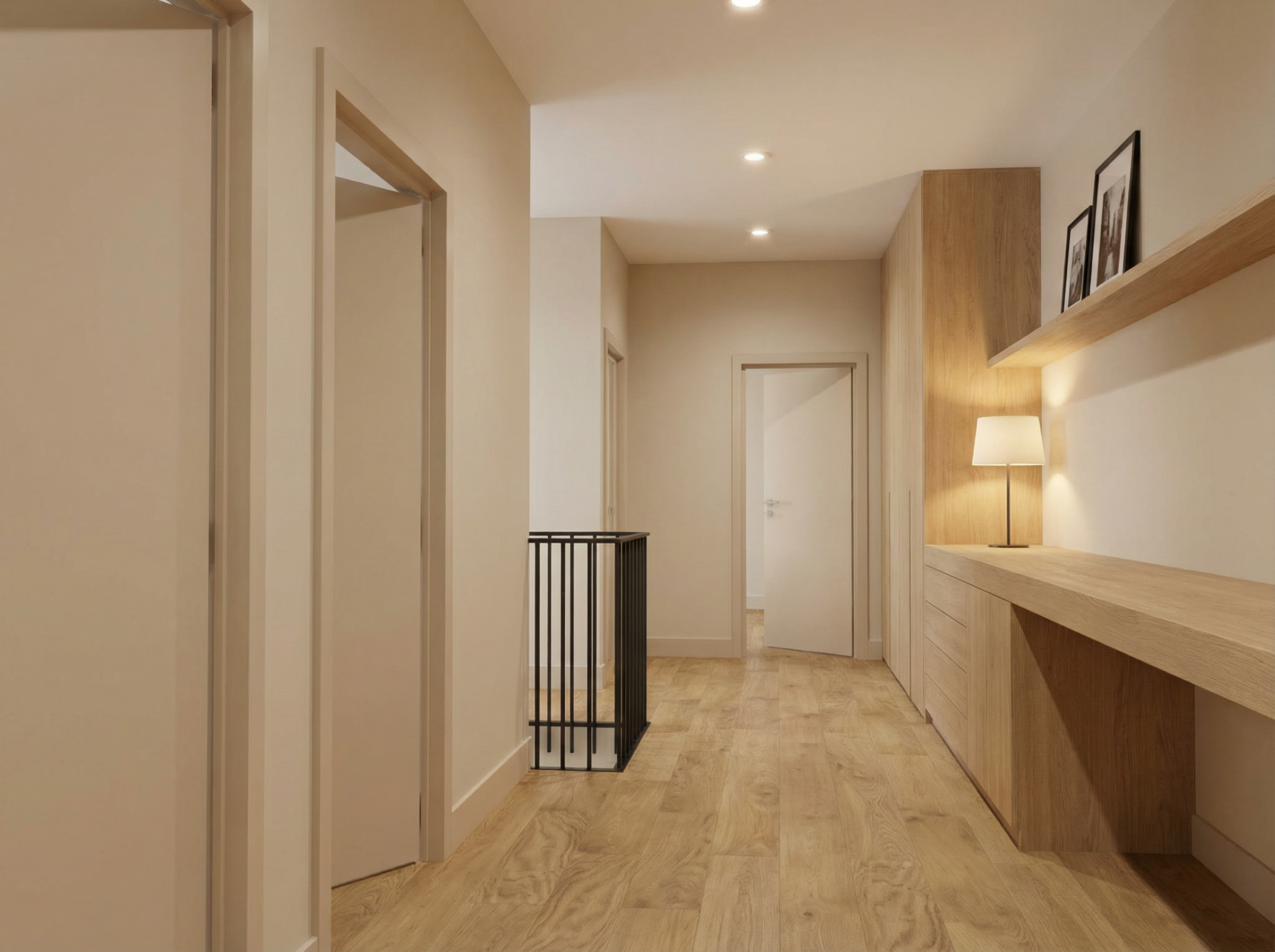 a contemporary ranch featuring a light gray exterior siding with dark gray trim the roof is a dark charcoal color adding contrast windows reflect the clear blue sky the front doors are stained mahogany surrounding the house a lush green lawn with colorful flower beds in shades of pink lavender and yellow the atmosphere is serene and welcoming with soft sunlight casting gentle shadows