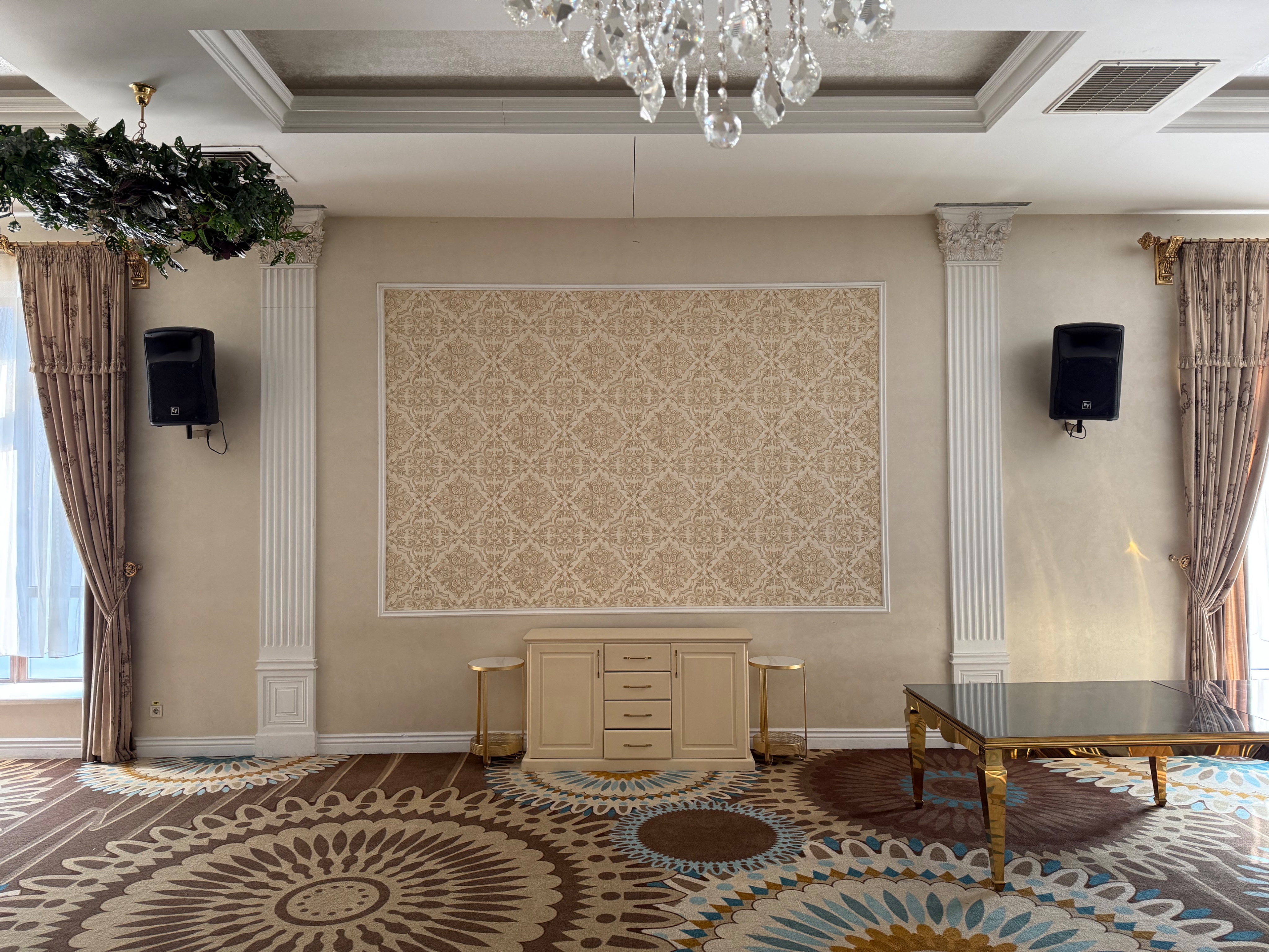 this is an interior photo from a wedding ballroom redesign the wall in a more modern contemporary way but keep an elegant look appropriate for a wedding reception do not alter the floor or the ceiling keep these exactly the same use warm tones and sleek elegant finishes
