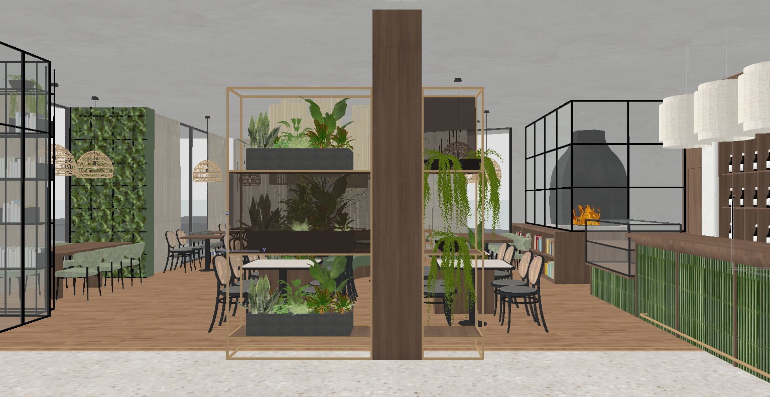 this is a modern interior in the light and natural light rendering make it look like it was done at noon don t change anything from the design just replace the materials and objects with more realistic and high quality ones the counter is made of olive green tiles and has a wood sheen the wood material that was used was replaced with the same wood material as in the photo but with high quality and few lines let it be softer and the material that the walls are painted with is limewash the cabinets behind the counter are filled with wine bottles the lights above the counter are made of a creamy white fabric where you can see a little light inside the glass of the counter is filled with sandwiches and the other glass on the left side on the wall at the end of the photo behind the glass we have a fireplace for preparing pizzas i will replace the chairs with the same ones but with high quality and real ones the rattan chairs have wooden legs make the render look real and with high quality make it look like the previous render the lighting and the colors don t change anything in the design