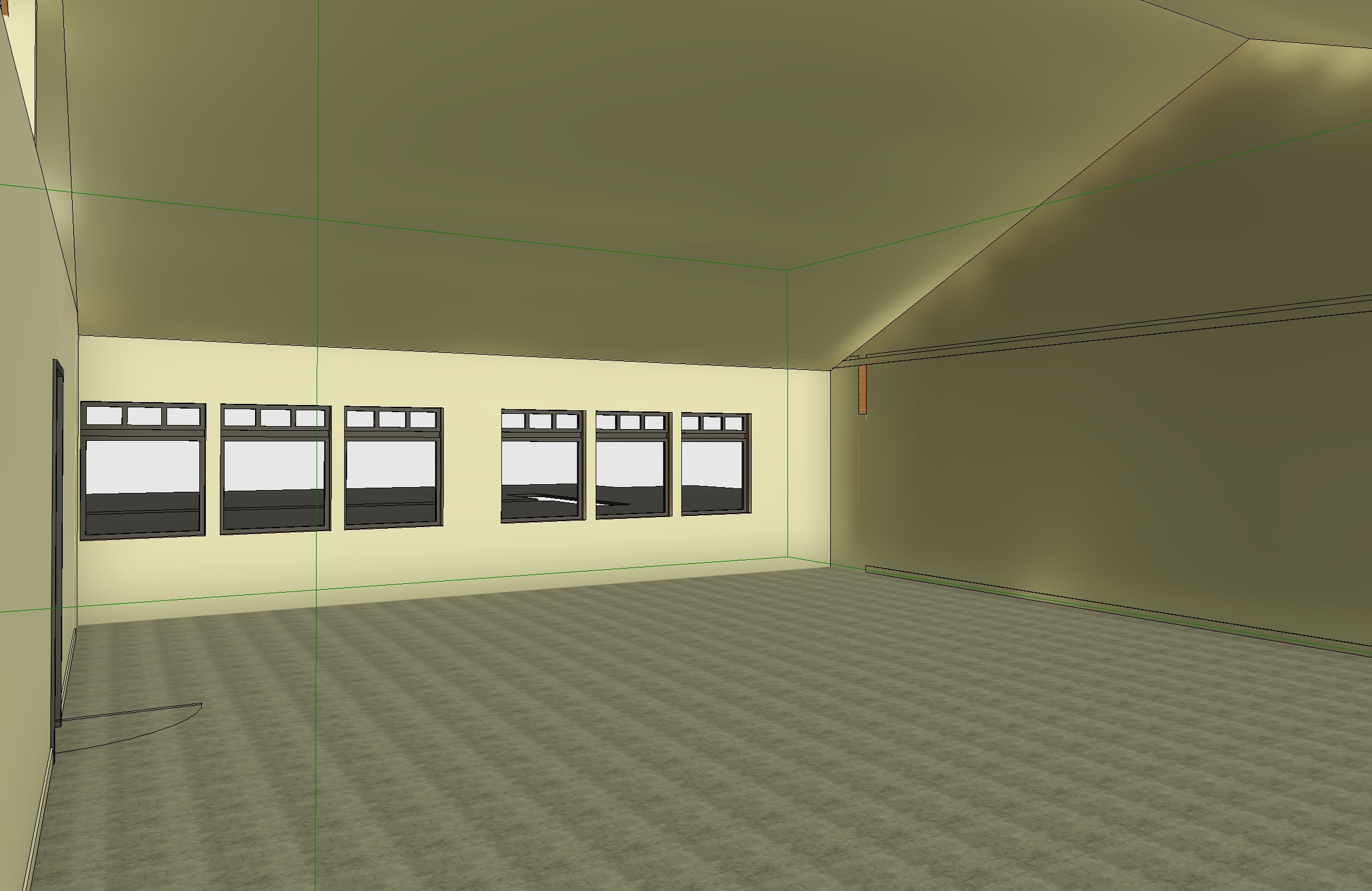make the space exactly 34 feet x 43 feet space into a california craftsman college laboratory with exposed wood trusses fill the room with 8 foot suspended led light strips spaced 4 feet apart cabinets and upper cabinet storage stools on all wood lab tables carpet tile flooring with male and female college students working on biology laboratory tables