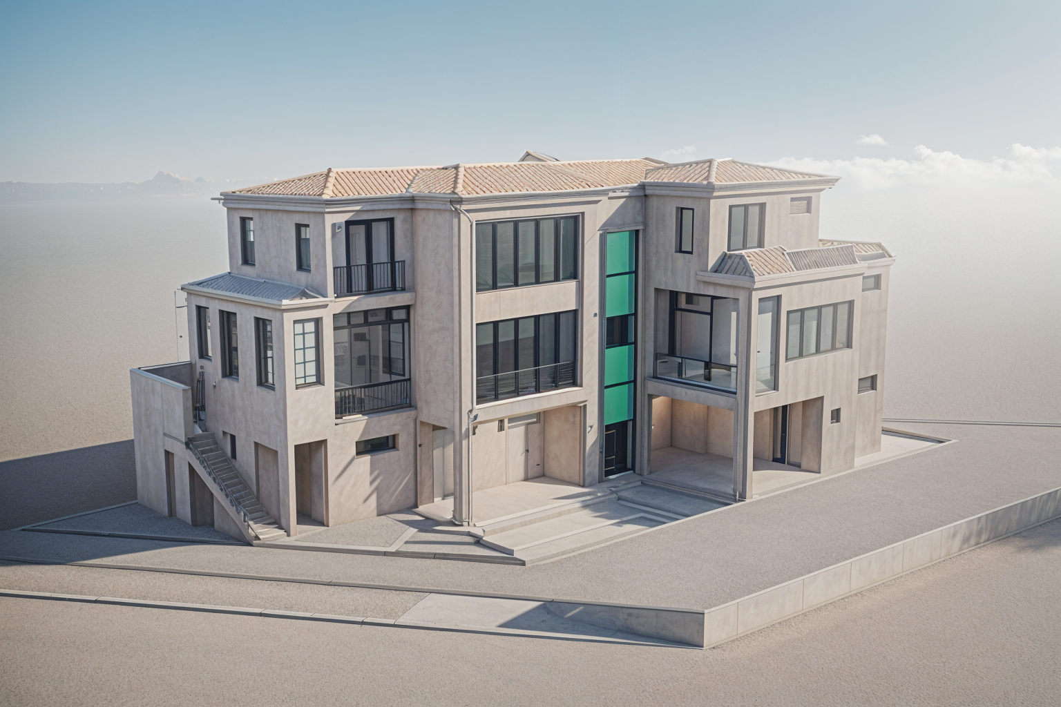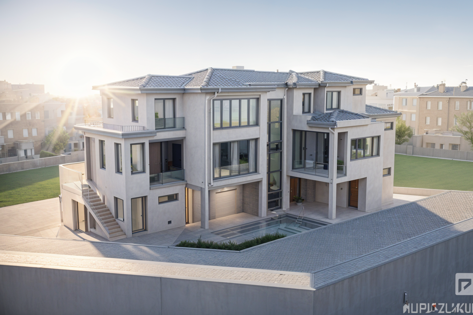 country french house with white brick and grey board and batten siding with grey stone accents and wood accents on porch and balcony blue sky with clouds wooden garage door on the side with driveway