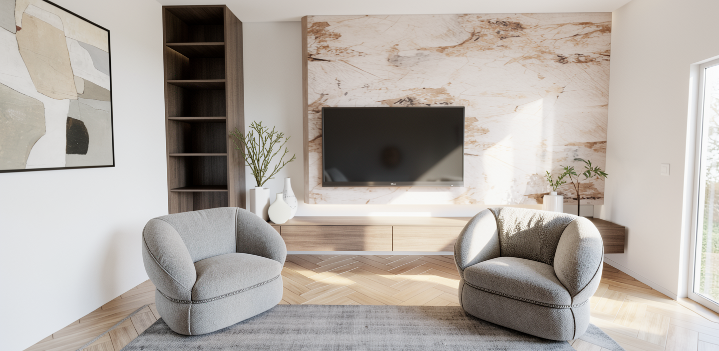 towering modern skyscraper amidst lush green hills with a complex structure made light grey concrete walls the building sports a unique geometric design with terraces adorned with greenery the surrounding hills are a vibrant green providing a serene backdrop a crystal clear pool reflects the bright blue sky earthy tones are present in the scattered trees and the subtle pathways atmosphere is peaceful and harmonious conveying a sense of futuristic urban living blended with nature please fill the surrounding hills with olive trees and some houses make it an elite residential zone