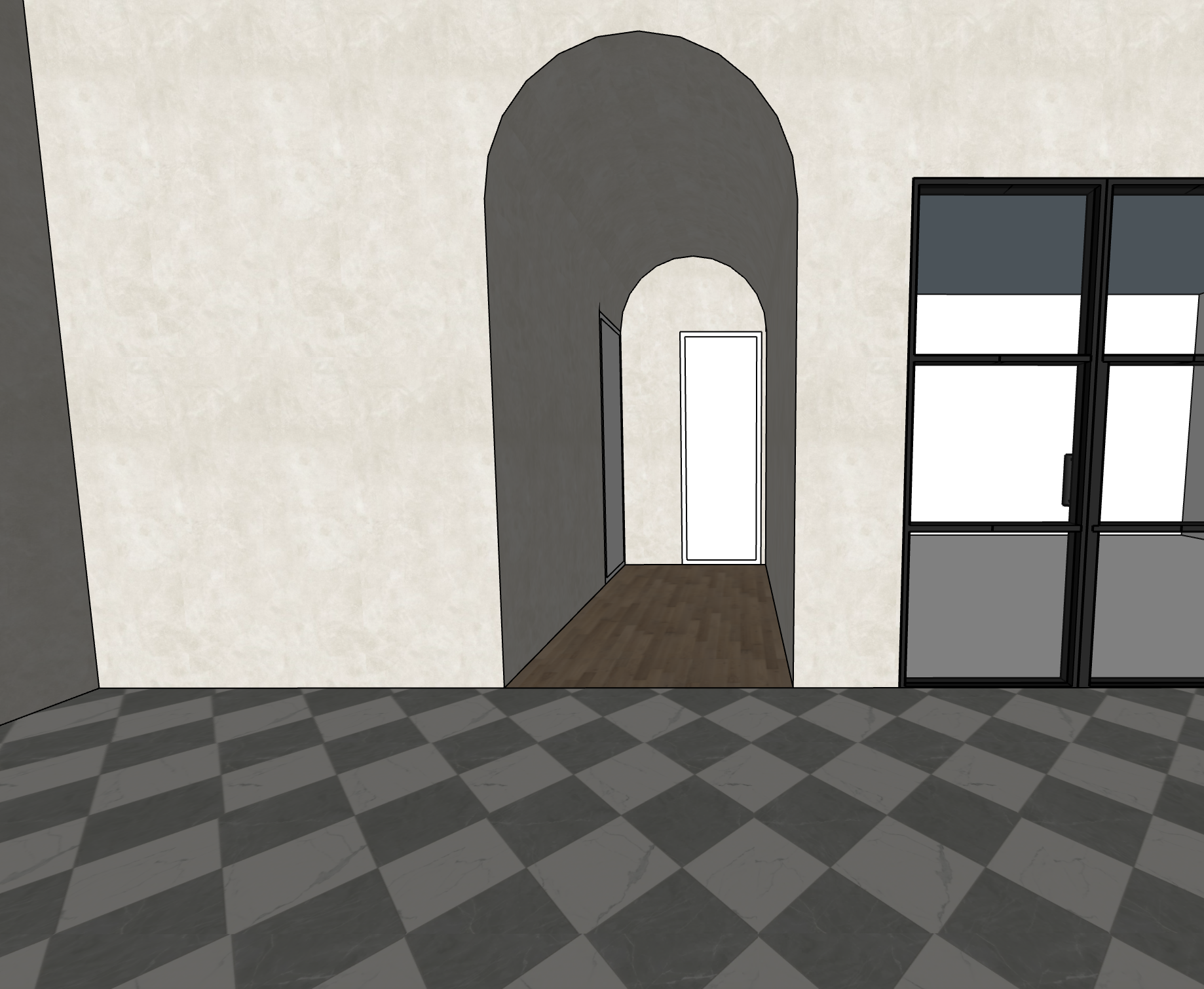luxurious home with a fully arched hallway at the end is a shaker interior door with a brass door knob to the right is a black and glass double door leading to a cool family room that had white and brown furniture