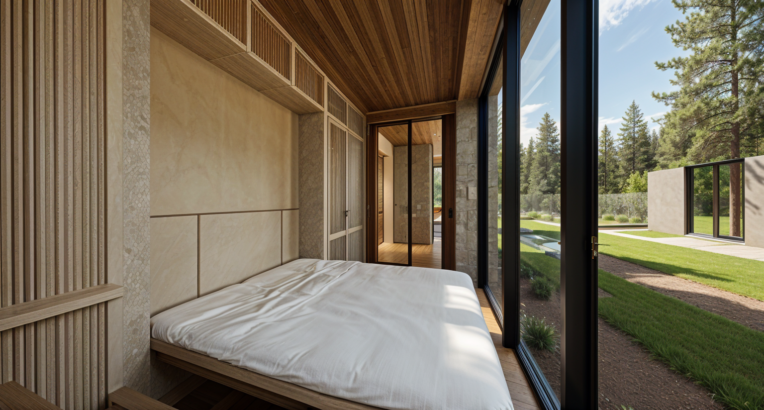 render a modern rustic house with a large sloped metal roof in a sleek dark gray the house exterior is shiny grey steel complemented by soft stone accents in light gray the porch is spacious with comfortable seating surround the house with a lush green lawn and a smooth driveway in pure white the sun is setting casting a gentle golden glow over the scene creating a calm and inviting atmosphere the background should be dense with rich green trees adding depth and tranquility to the setting